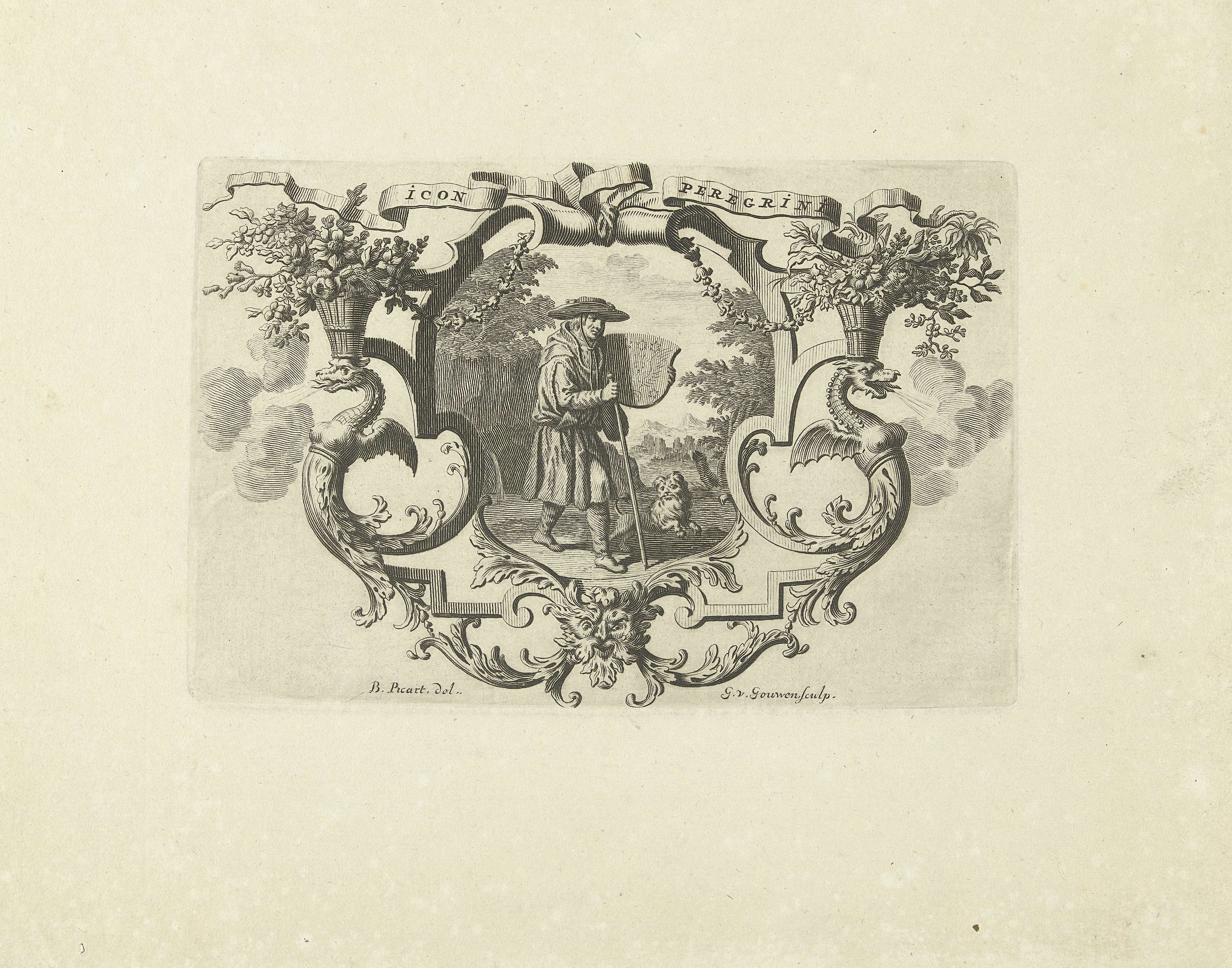 Emblematische voorstelling: Mercurius als een pelgrim met een hond. In zijn hand een schild met een zon en drie sterren. Rondom de voorstelling ornamenten met fabelwezens.