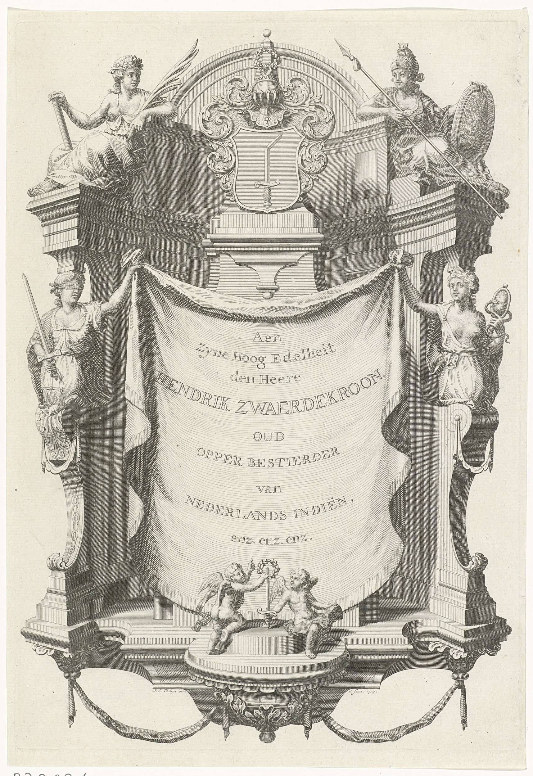 Wapenschild van Hendrik Zwaerdekroon, gouverneur van Nederlands-Indië, in een ornamentele omlijsting met Rechtvaardigheid (Justitia) en Voorzichtigheid (Prudentia). Zij houden een doek vast waarop een opdracht aan de gouverneur in het Nederlands. De omlijsting wordt bekroond door de personificatie van Kracht (Fortitudo) en Minerva.
