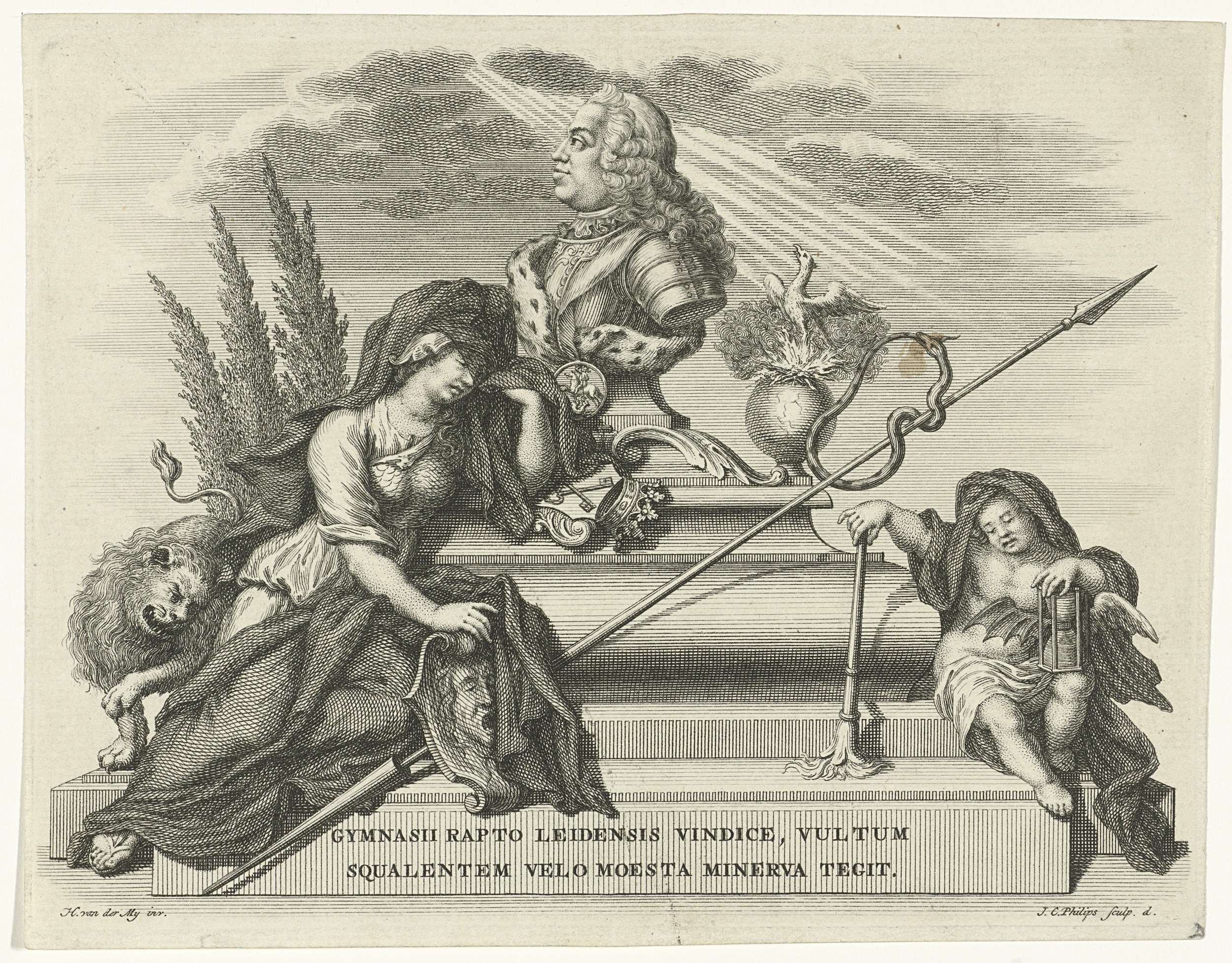 Allegorie op het overlijden van stadhouder Willem IV op 22 oktober 1751. Portretbuste van de prins op een graftombe, geflankeerd door een feniks die zichzelf verbrandt, als verwijzing naar Christus' opstanding. Op de rand van de tombe een treurende Minerva, leunend op het stadswapen van Leiden, en een putto met een gevleugelde zandloper en een ...