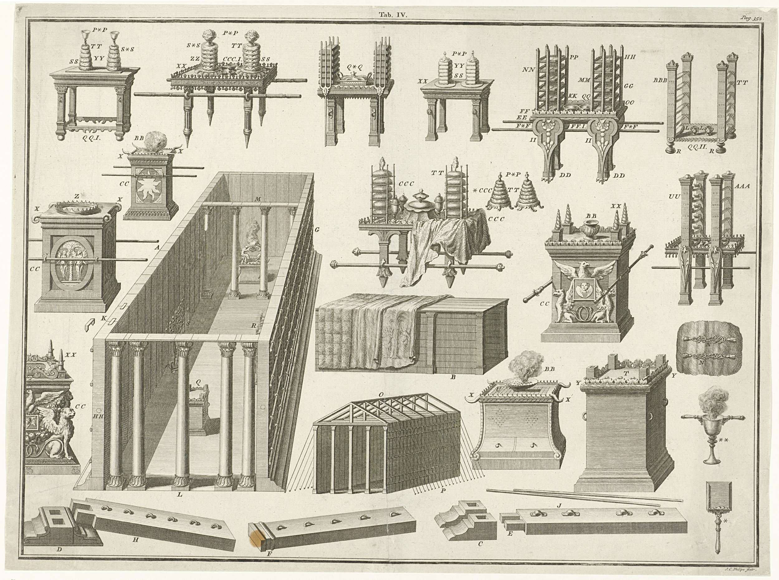 Blad met een tempel, diverse altaren en voorwerpen die gebruikt worden om te offeren. Bij elke afbeelding staat een letter die bij een legenda hoort.