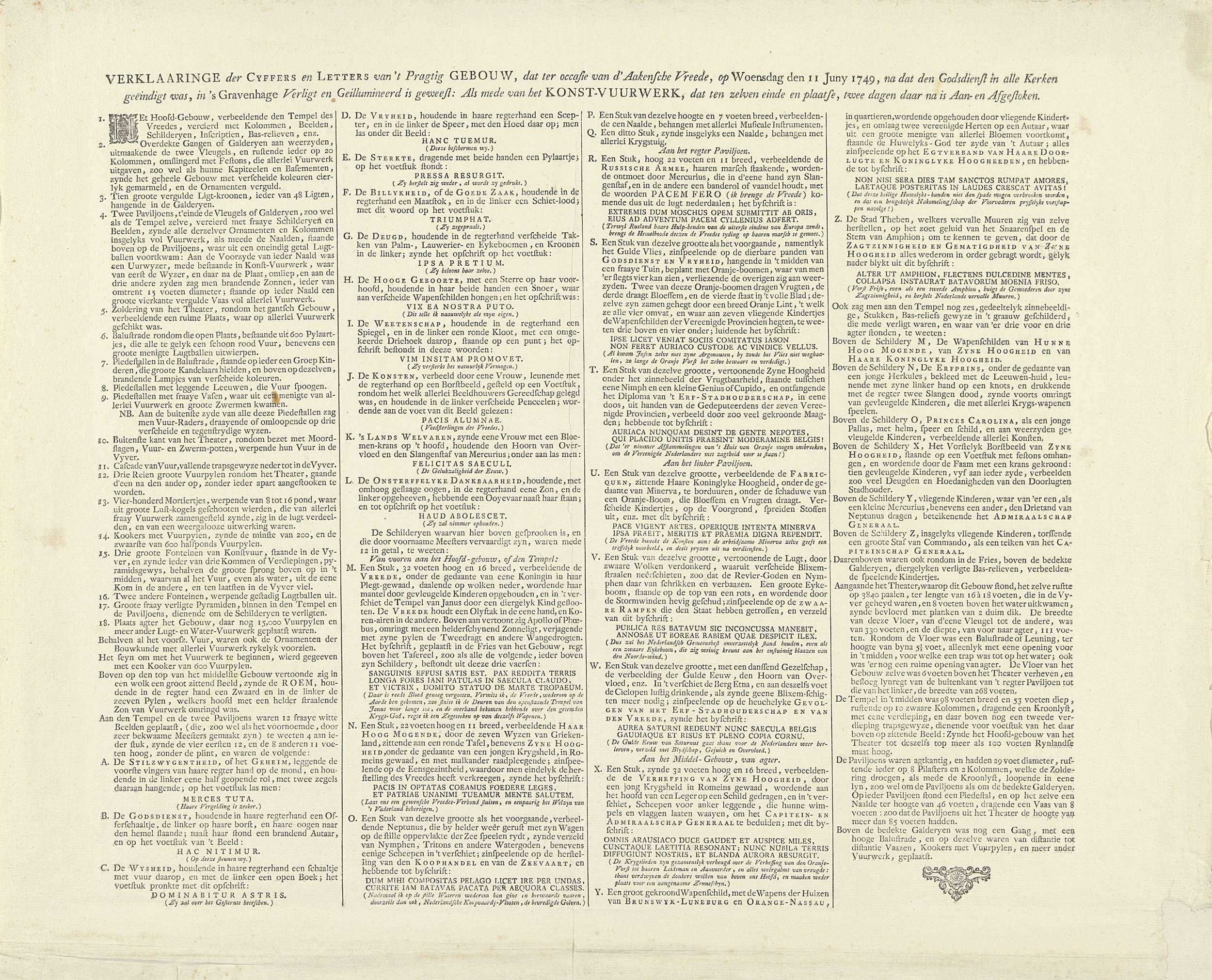 Tekstblad met de verklaring bij de prenten van het vuurwerk op het grote theater in de Hofvijver te Den Haag, op 13 juni 1749 afgestoken ter ere van de Vrede van Aken gesloten op 18 oktober 1748. Bij de verklaring horen een voorstelling van het vuurwerk en een plattegrond van het theater.
