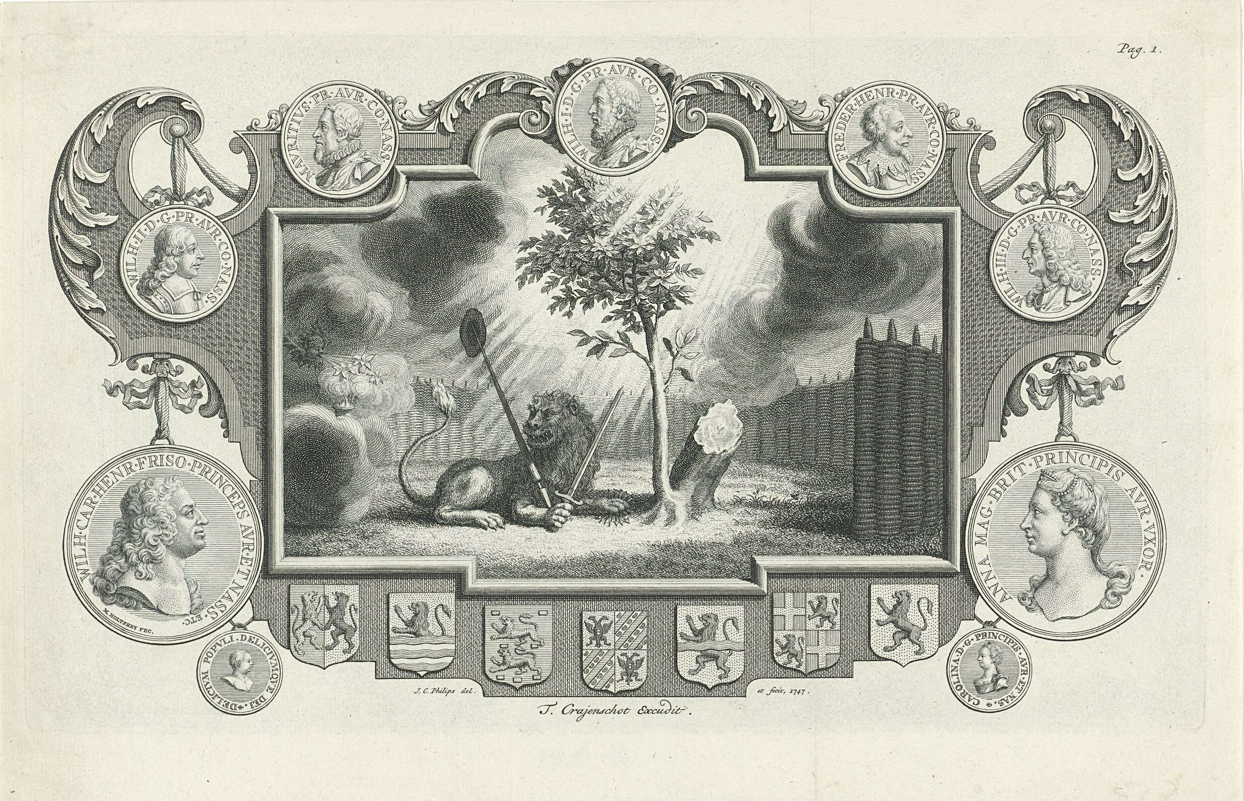 Allegorie op de verheffing van prins Willem IV tot stadhouder in mei 1747. De Nederlandse Leeuw met zwaard, lans en vrijheidshoed wakend in de Hollandse Tuin bij de door het goddelijke licht beschenen Oranjeboom. In omlijsting met wapens van de zeven provincies en portretmedaillons van prins Willem IV en zijn vrouw Anna van Hannover en ...