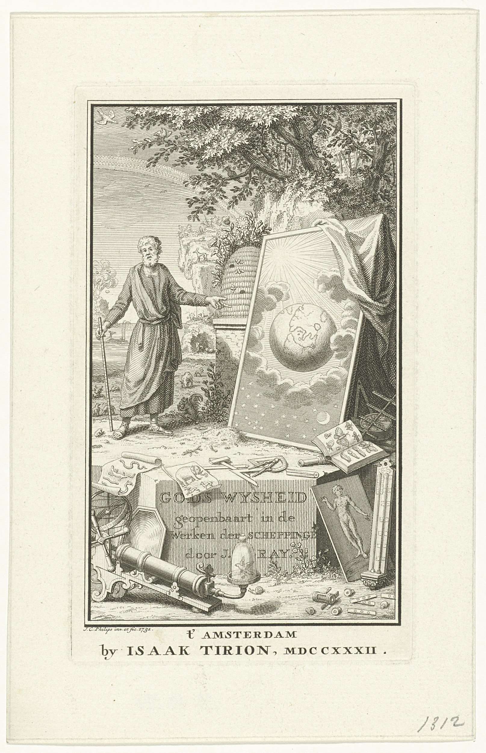 Paradijselijk landschap met een bebaarde man, wijzend op een schilderij waarop de vierde dag van de schepping is voorgesteld: de aardbol te midden van de zon, maan en sterren. Ernaast een bijenkorf, die symbool staat voor vlijtig werken. Op de voorgrond de titel in het Nederlands en diverse attributen die de schepping symboliseren.