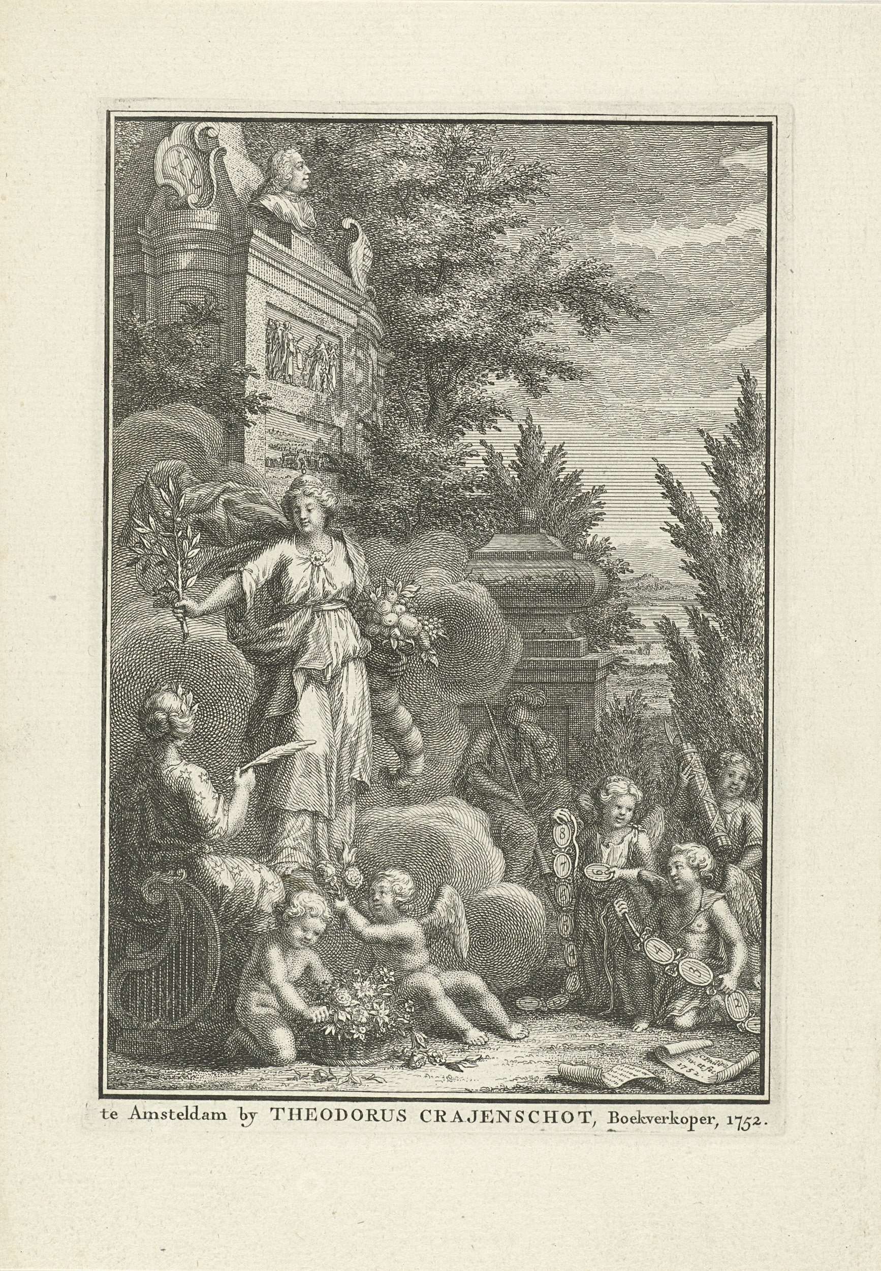 Vrede, met een hoorn des overvloeds in de hand, overhandigt de Poëzie een olijftak. Op de achtergrond de treurende Nederlandse Maagd bij de graftombe van prins Willem IV van Oranje-Nassau, waarop zijn portretbuste. Rechts op de voorgrond putti die met genummerde medaillons spelen.