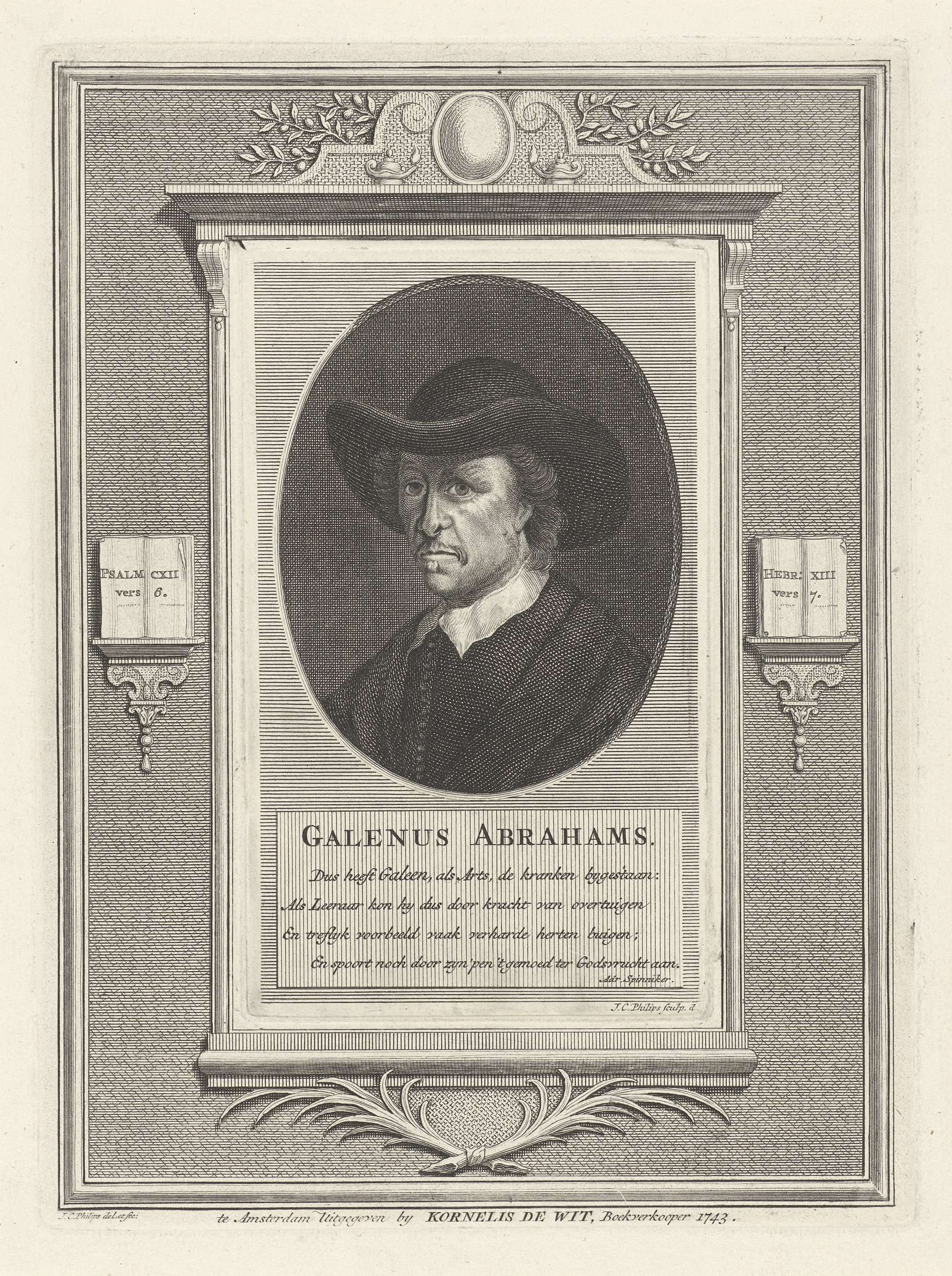 Portret van Galenus Abrahamsz. de Haan, medicus en doopsgezind leraar te Amsterdam. In het kader een vierregelig lofdicht in het Nederlands. Het portret is gevat in een decoratieve omlijsting met aan weerszijden een opengeslagen bijbel.
