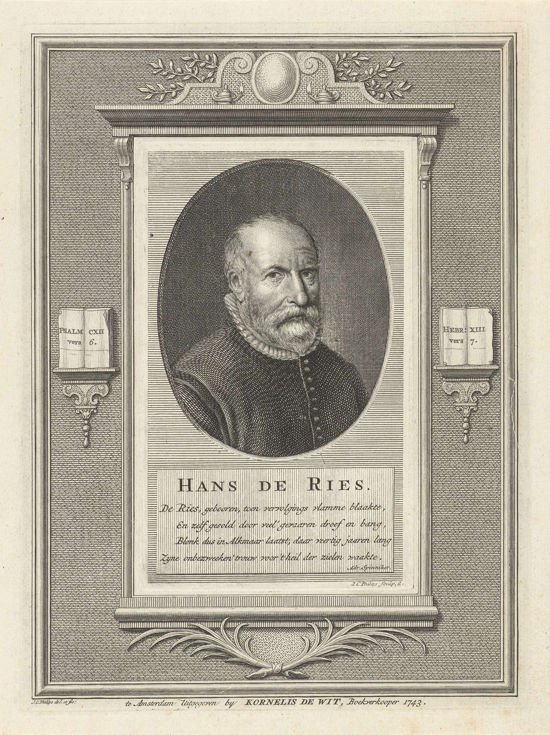 Portret van de doopsgezinde predikant Hans de Ries. In het kader een vierregelig lofdicht in het Nederlands. Het portret is gevat in een decoratieve omlijsting met aan weerszijden een opengeslagen bijbel.