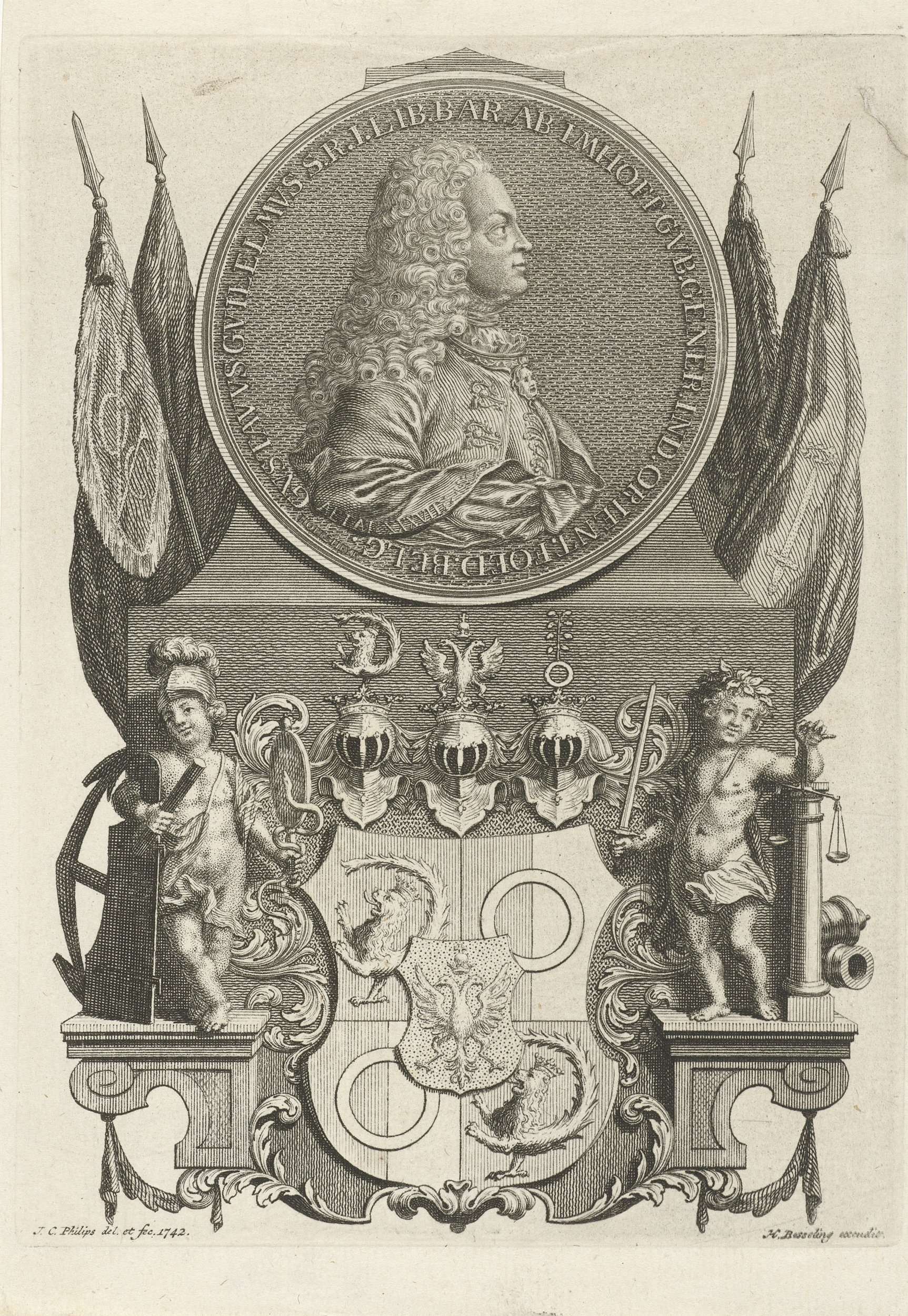 Medaille met het portret van gouverneur-generaal Gustaaf Willem, baron van Imhoff (I). Onder het portret zijn wapenschild, dat wordt geflankeerd door putti met de attributen van Voorzichtigheid en Rechtvaardigheid.