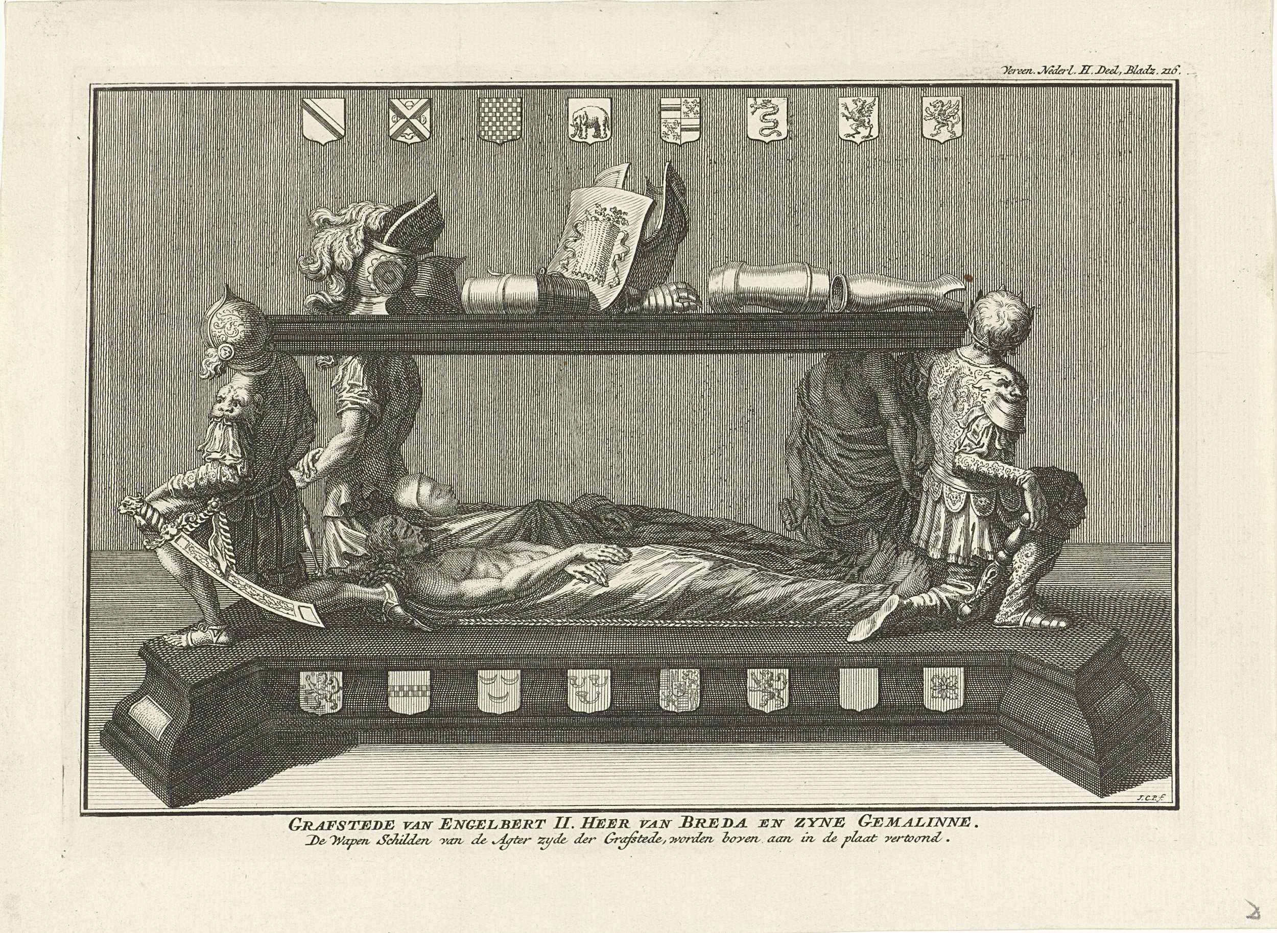 Praalgraf van Engelbert II en zijn vrouw in de Grote Kerk te Breda. Boven en onder verschillende wapenschilden. Op dekplaat zijn wapenuitrusting.
