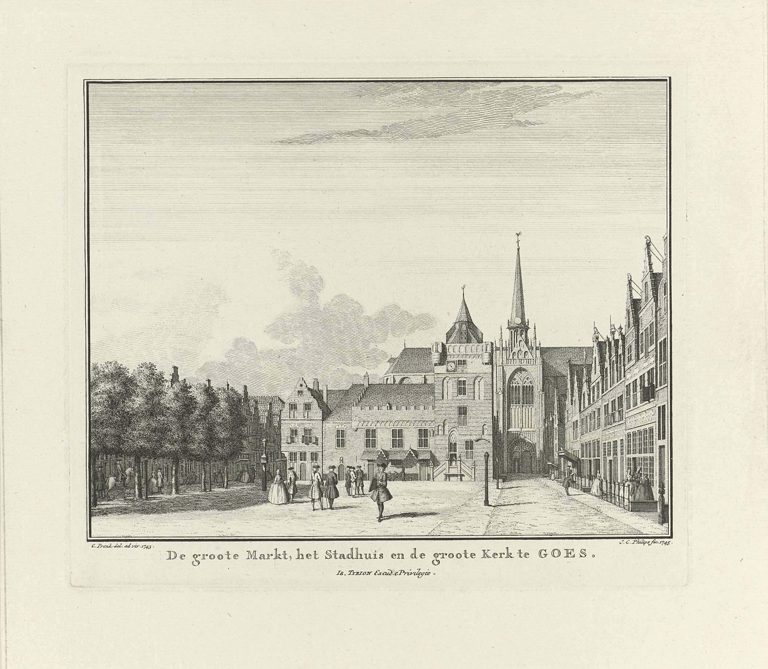 Gezicht op de Grote Markt, het stadhuis en de Grote Kerk te Goes, 1743