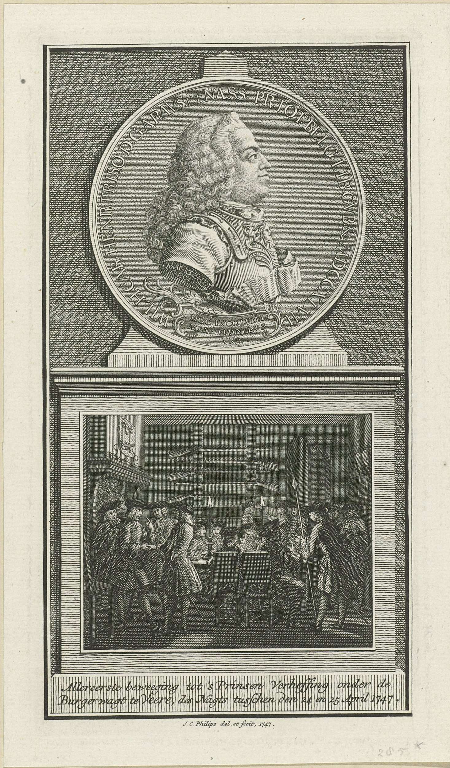Eerste initiatieven tot de verheffing van Willem IV tot stadhouder van Zeeland onder de burgerwacht te Veere, in de nacht van 24 op 25 april 1747. Wachtlokaal waarin leden van de schutterij beraadslagen. Bovenaan een medaillon met het portret van prins Willem IV.