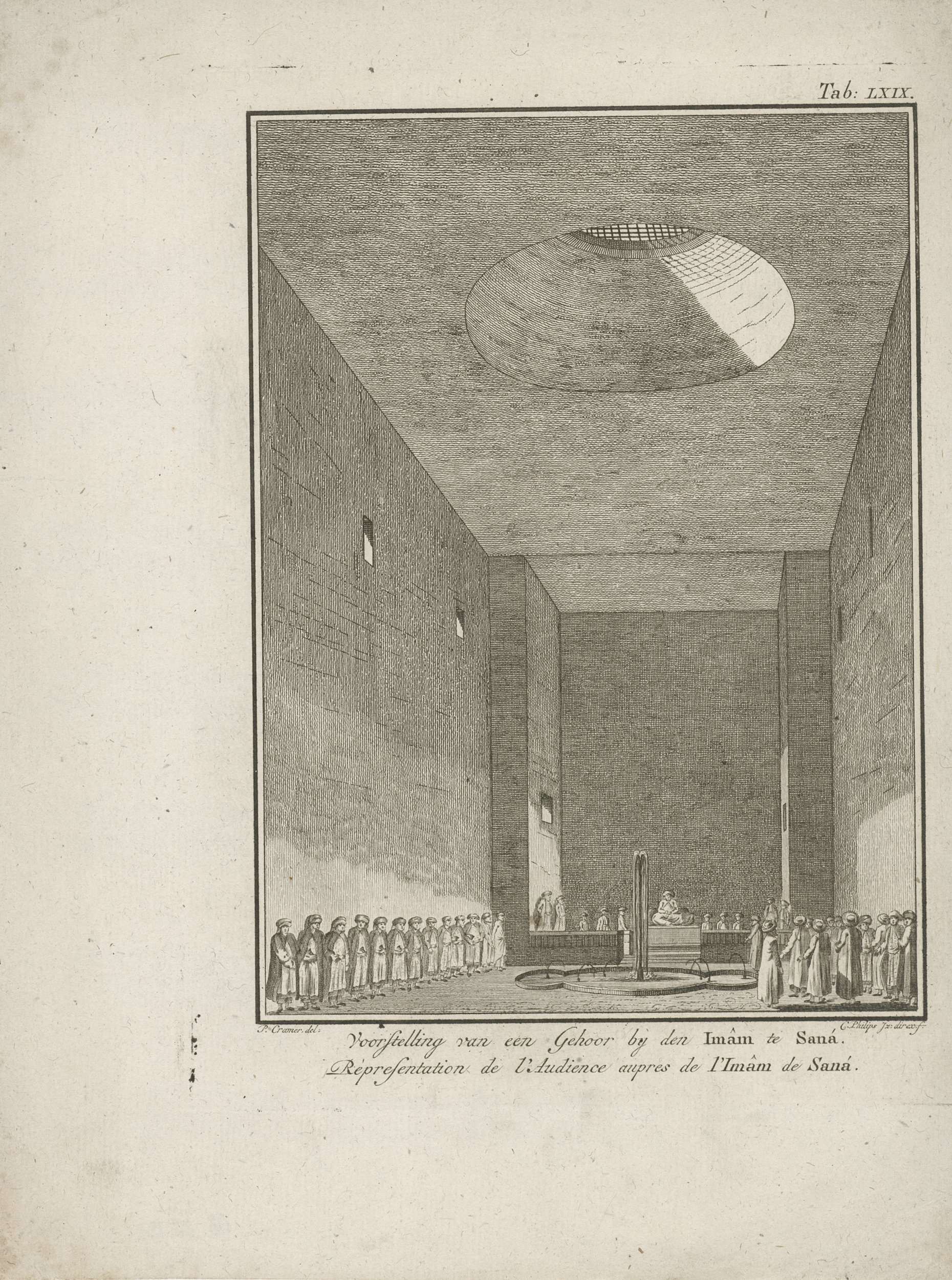 Interieur van een moskee waarin gelovigen naar de preek van een iman luisteren.