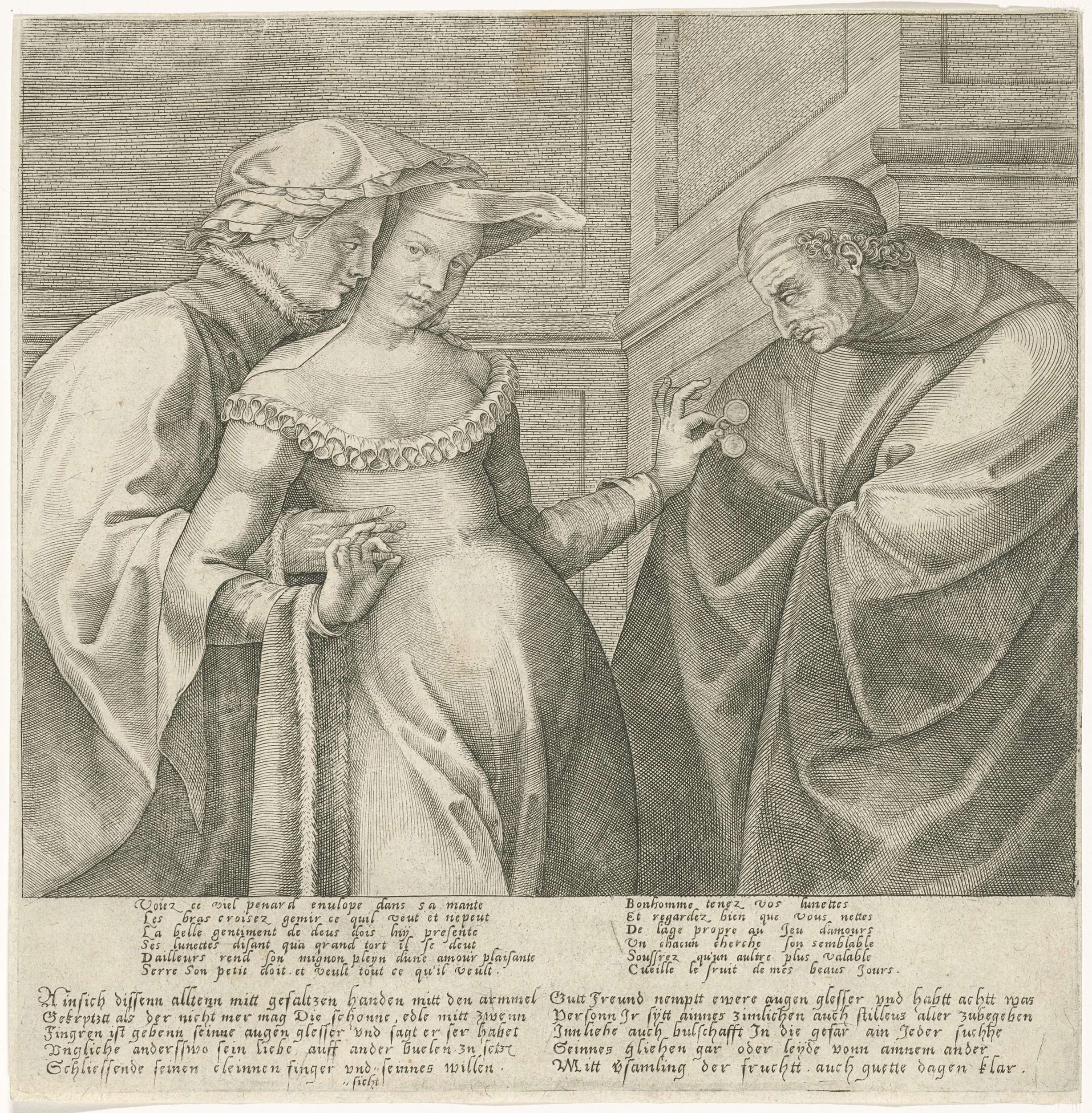 Allegorie op de liefde en impotentie: een jong paar omhelst elkaar, terwijl de vrouw een bril geeft aan een oude man. In de marge een twaalfregelig gedicht in het Frans en een tienregelig gedicht in het Duits, die de voorstelling toelichten.