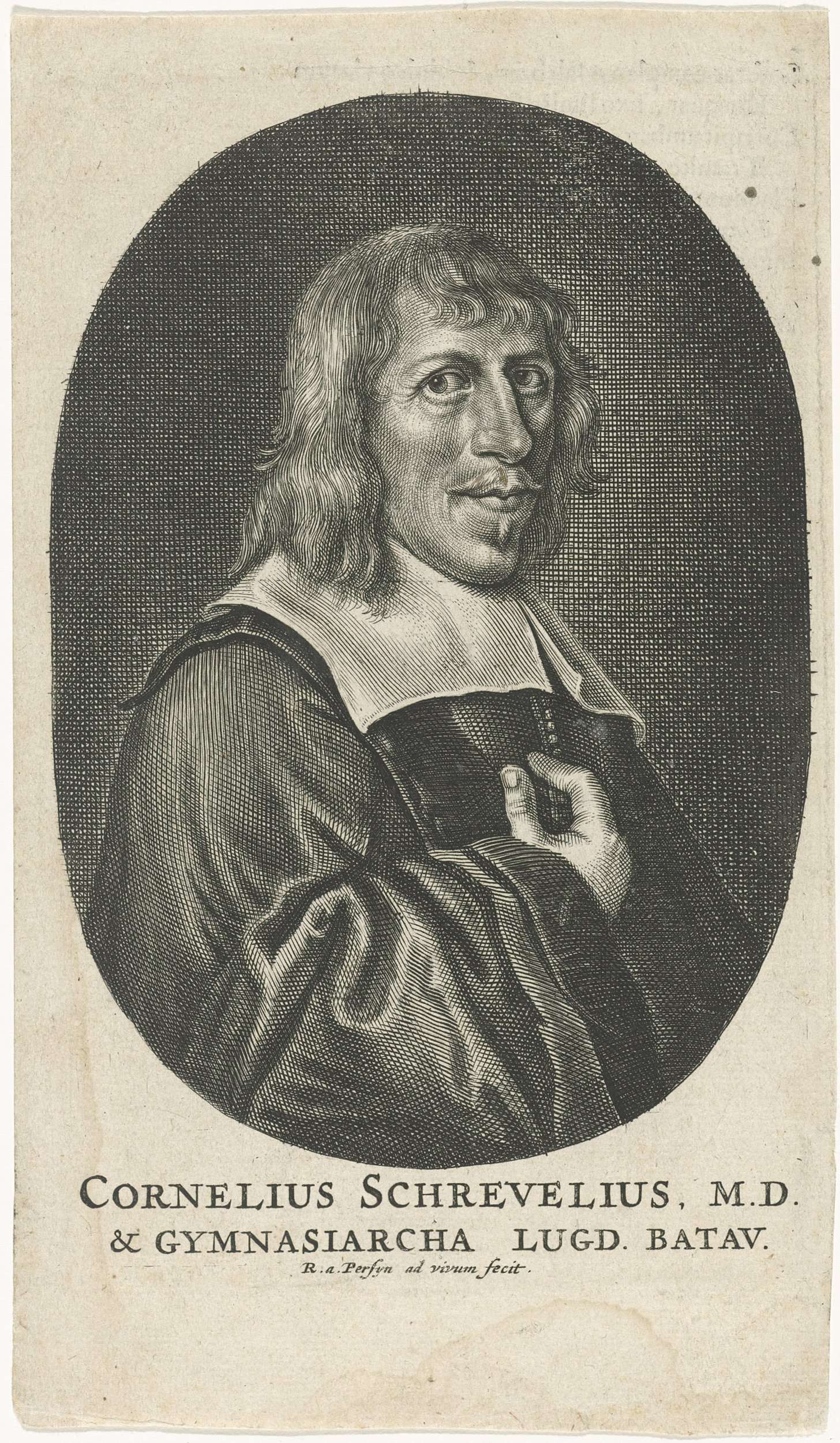 Portret van Cornelius Schrevelius, Nederlands filoloog en rector van de Latijnse school in Leiden. In de marge een tweeregelig onderschrift in het Latijn.