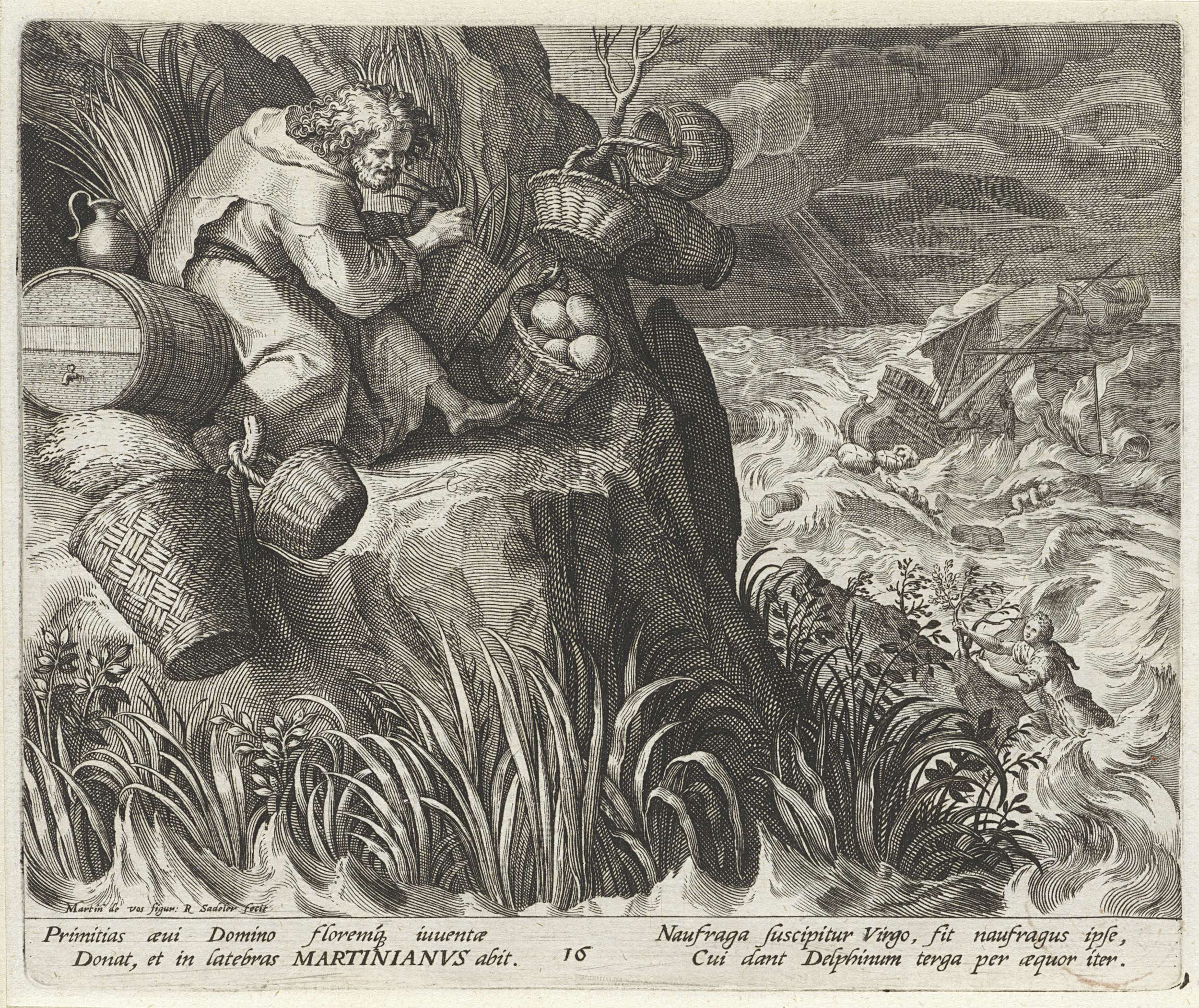 De H. Martinianus van Caesarea, een vroeg-christelijke kluizenaar, voor een grot langs de kust. Hij is manden aan het vlechten. Op de achtergrond een stormige zee met een schip in nood. Een vrouw probeert vanuit de zee aan wal te komen.