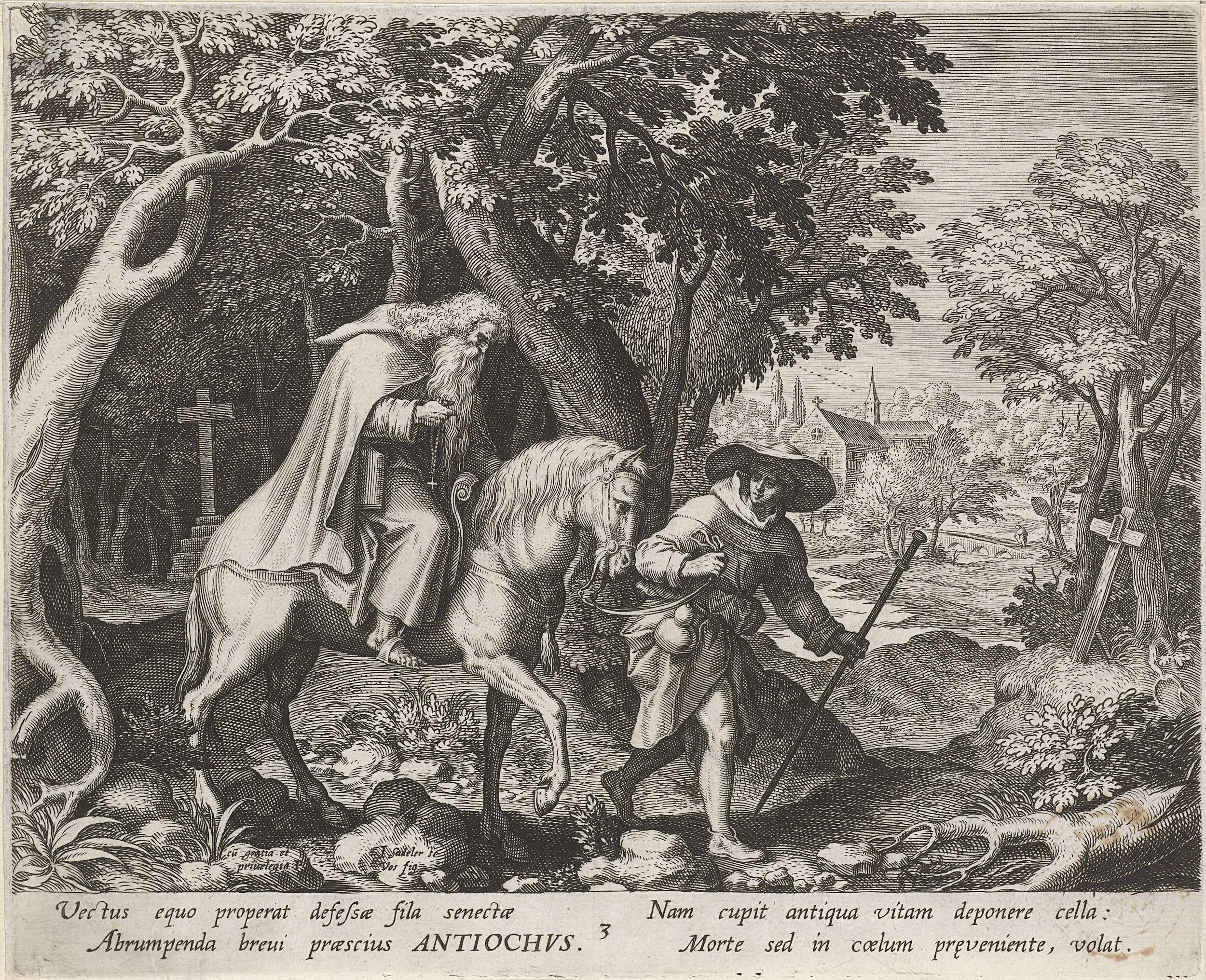 De H. Antiochus van Palestina (?), een vroegchristelijke kluizenaar, rijdend op een paard. Een man leidt hem door een bos. Op de achtergrond een kerk.