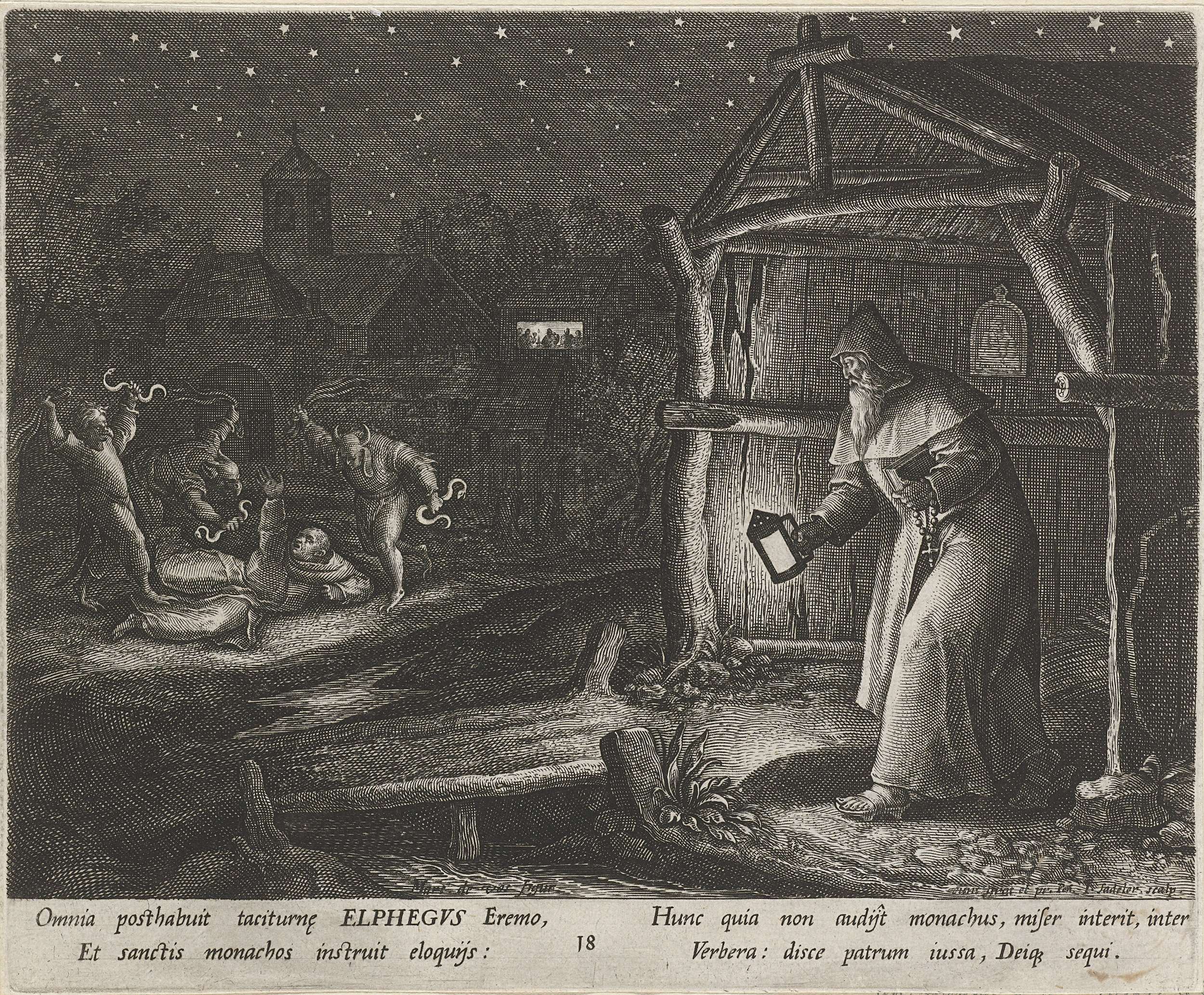 Op de voorgrond de H. Alphegus, een Engelse kluizenaar en de aartsbisschop van Canterbury. Hij staat voor zijn kluizenaarshut met een lamp. Op de achtergrond worden de monniken van Canterbury aangevallen door de Denen, die hen slaan met slangen en zwepen.