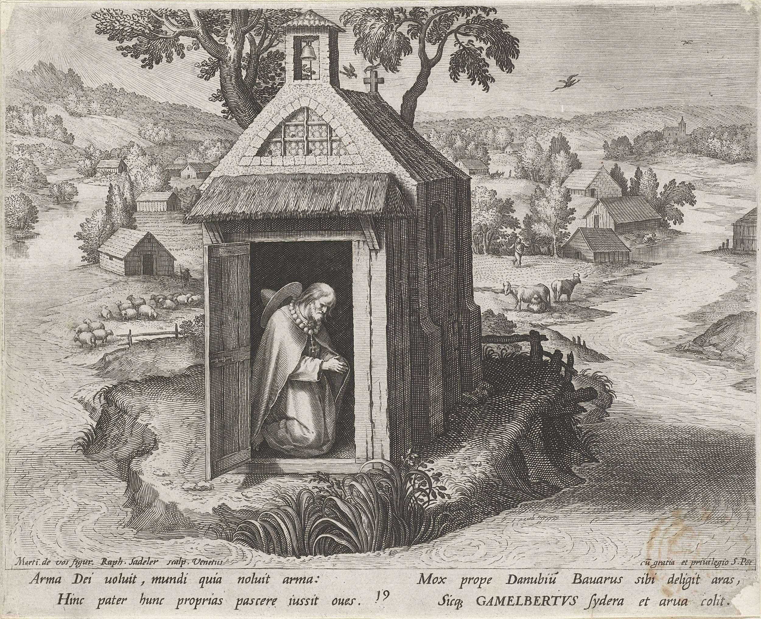 Gamelbertus, een Beierse kluizenaar, zit te bidden in een kapelletje op een eiland ten midden van de rivier de Donau. Op de achtergrond een landschap met vee.