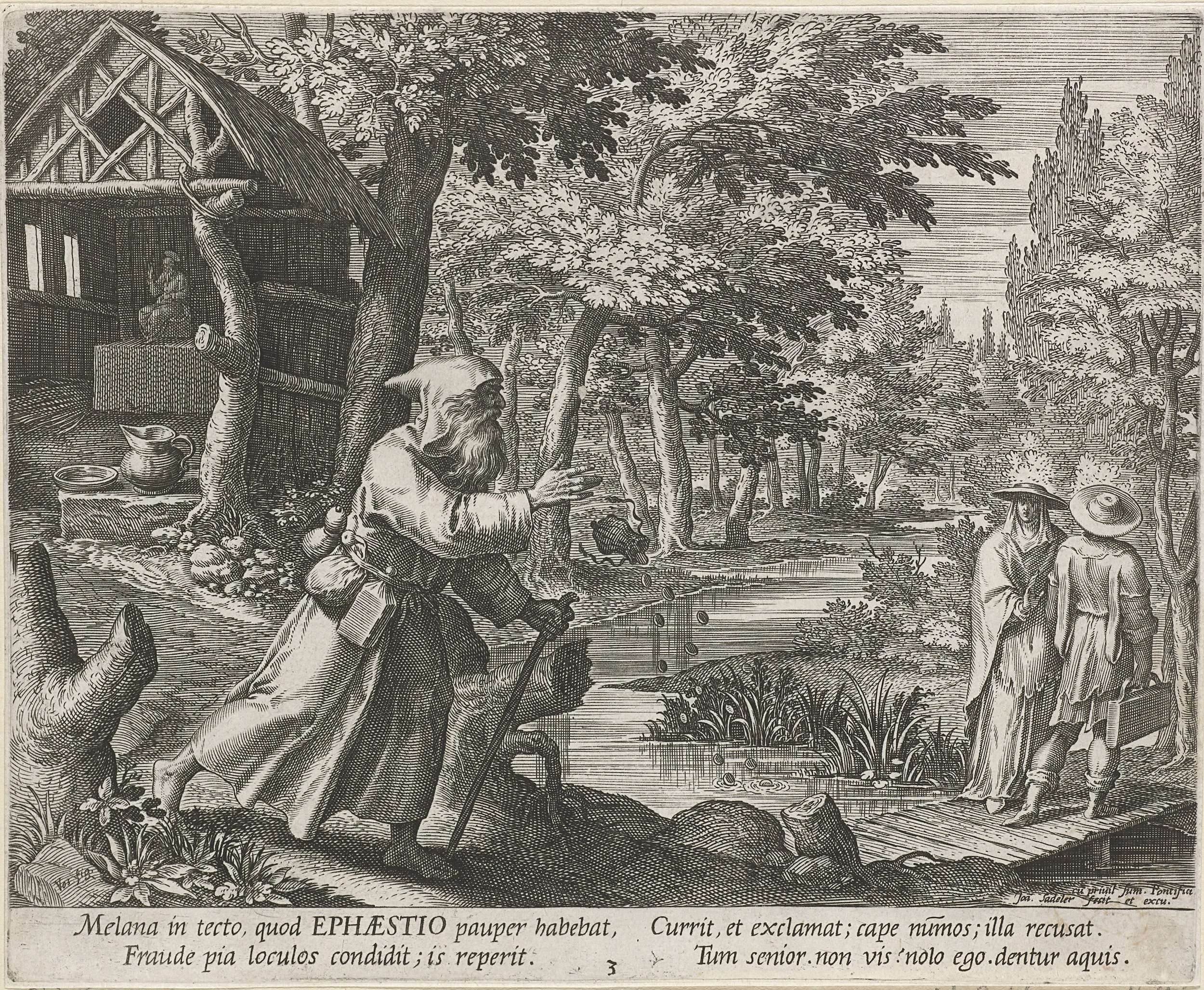 Op de voorgrond de kluizenaar Ephaestius. Hij gooit een buidel met munten in het water. Achter hem zijn kluizenaarshut. Links een paar reizigers die een brug oversteken. Op de achtergrond een boslandschap.