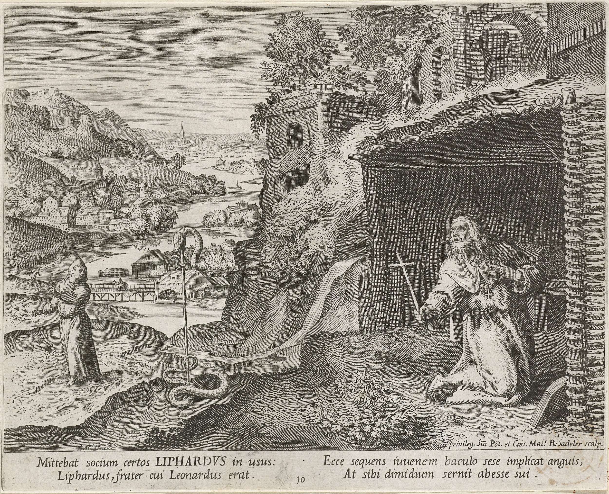 Een landschap met een ruïne. Op de voorgrond de H. Liphardus van Meung-sur-Loire, een kluizenaar uit de zesde eeuw na Christus. Hij zit geknield te bidden in zijn hut. Op de achtergrond een monnik naast een staf waarop het hoofd van een slang. Het lichaam van de slang ligt naast de staf op de grond.