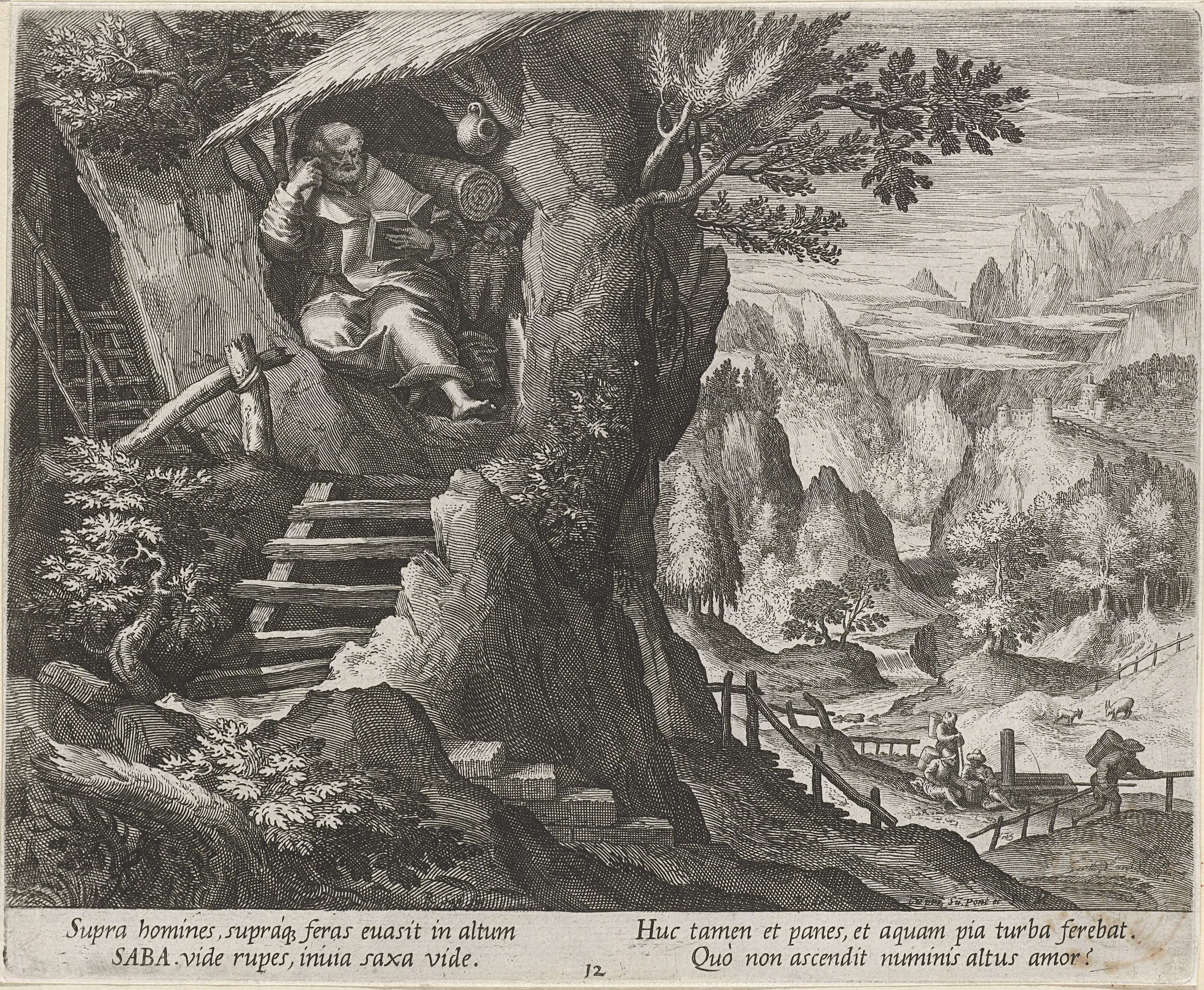 Een rotslandschap. Op de voorgrond zit de H. Sabas van Mar-Saba, een vroegchristelijke kluizenaar, een boek te lezen in een grot in een berg.