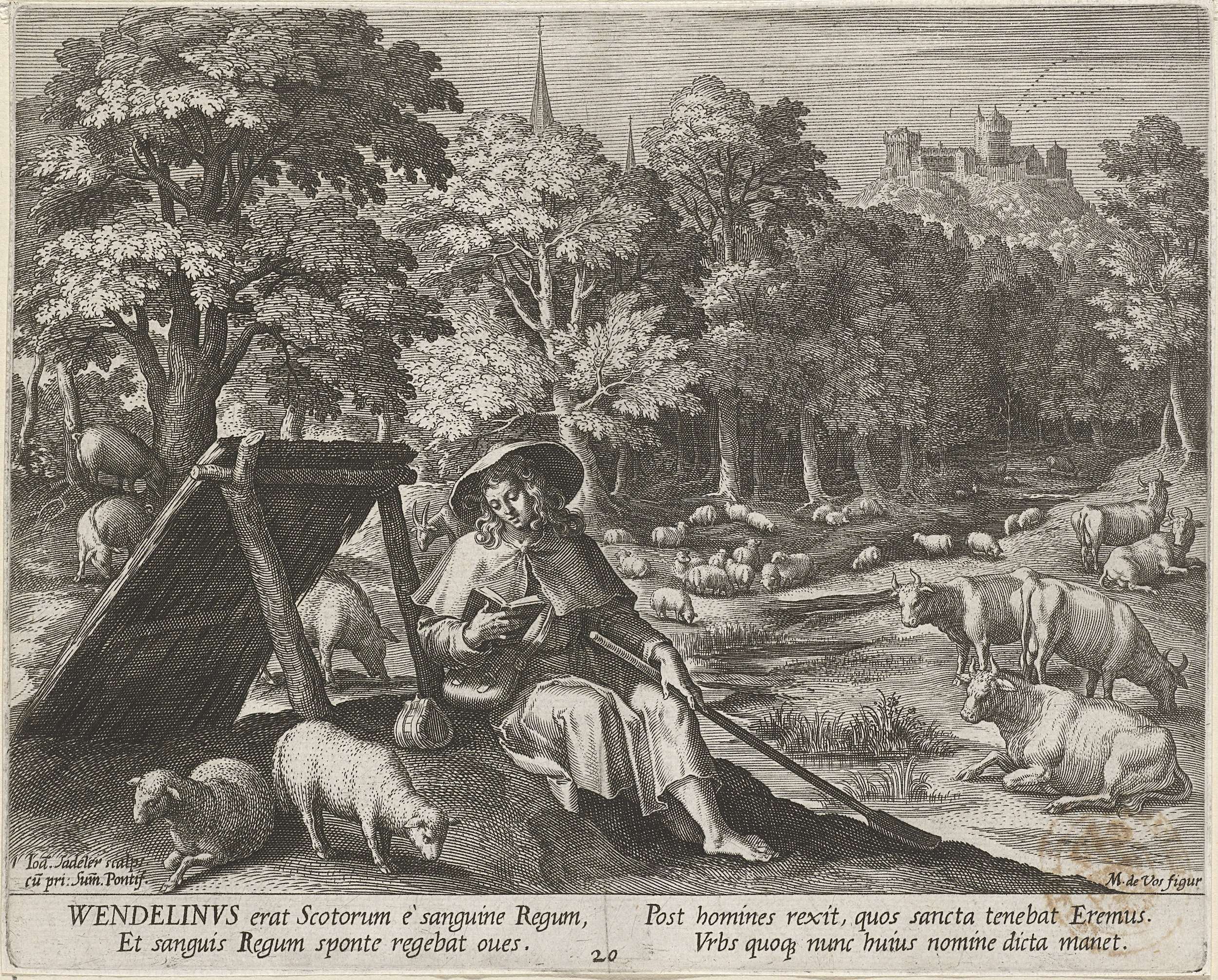 Een boslandschap. Op de voorgrond zit de H. Wendelinus van Trier, een kluizenaar uit de zevende eeuw na Christus, een boek te lezen. Rondom hem kuddes schapen, varkens en runderen.