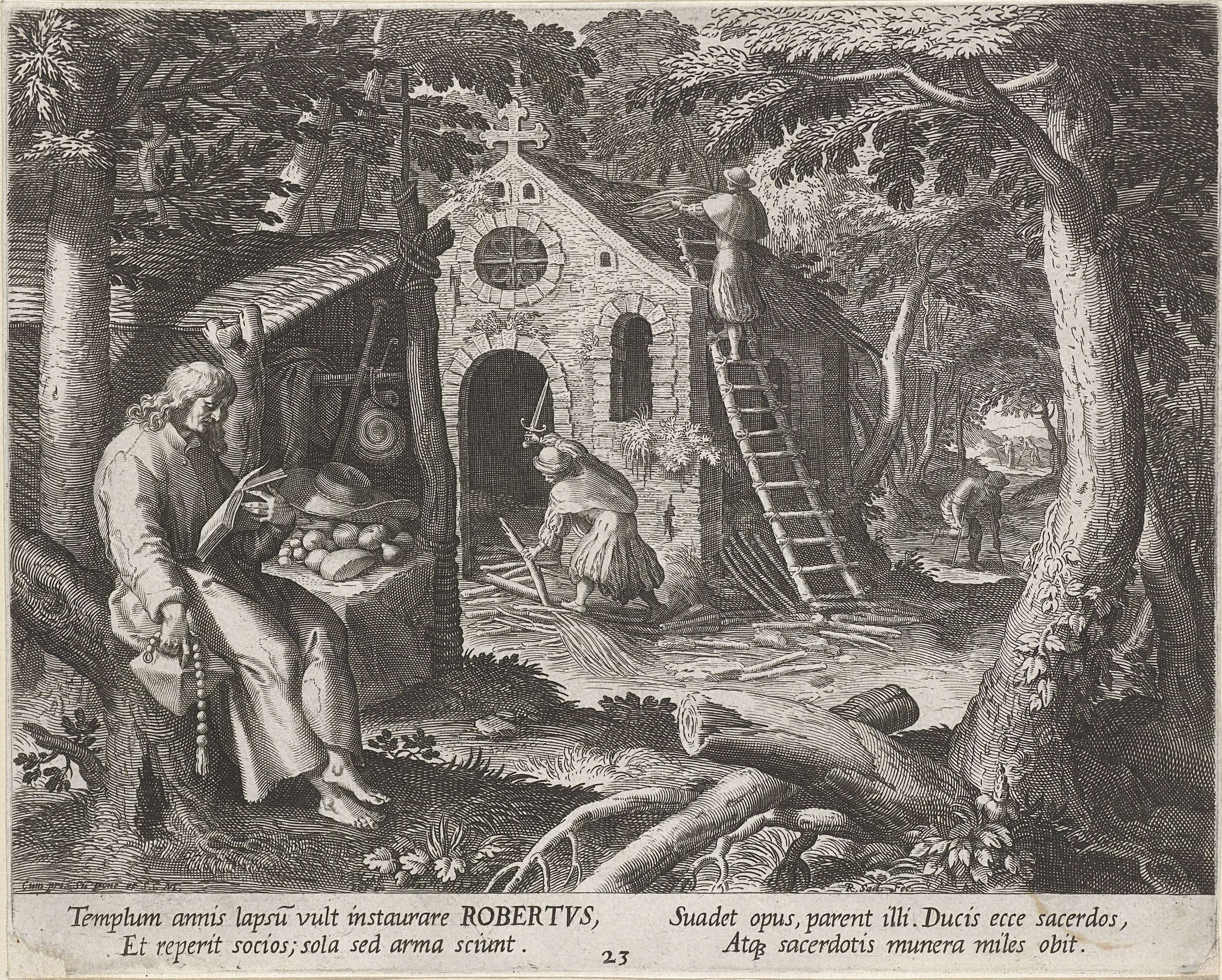 Een boslandschap. Op de voorgrond leest de H. Robertus van La Chaise-Dieu, een Franse kluizenaar, een boek. Op de achtergrond wordt een kerk gebouwd door enkele monniken0