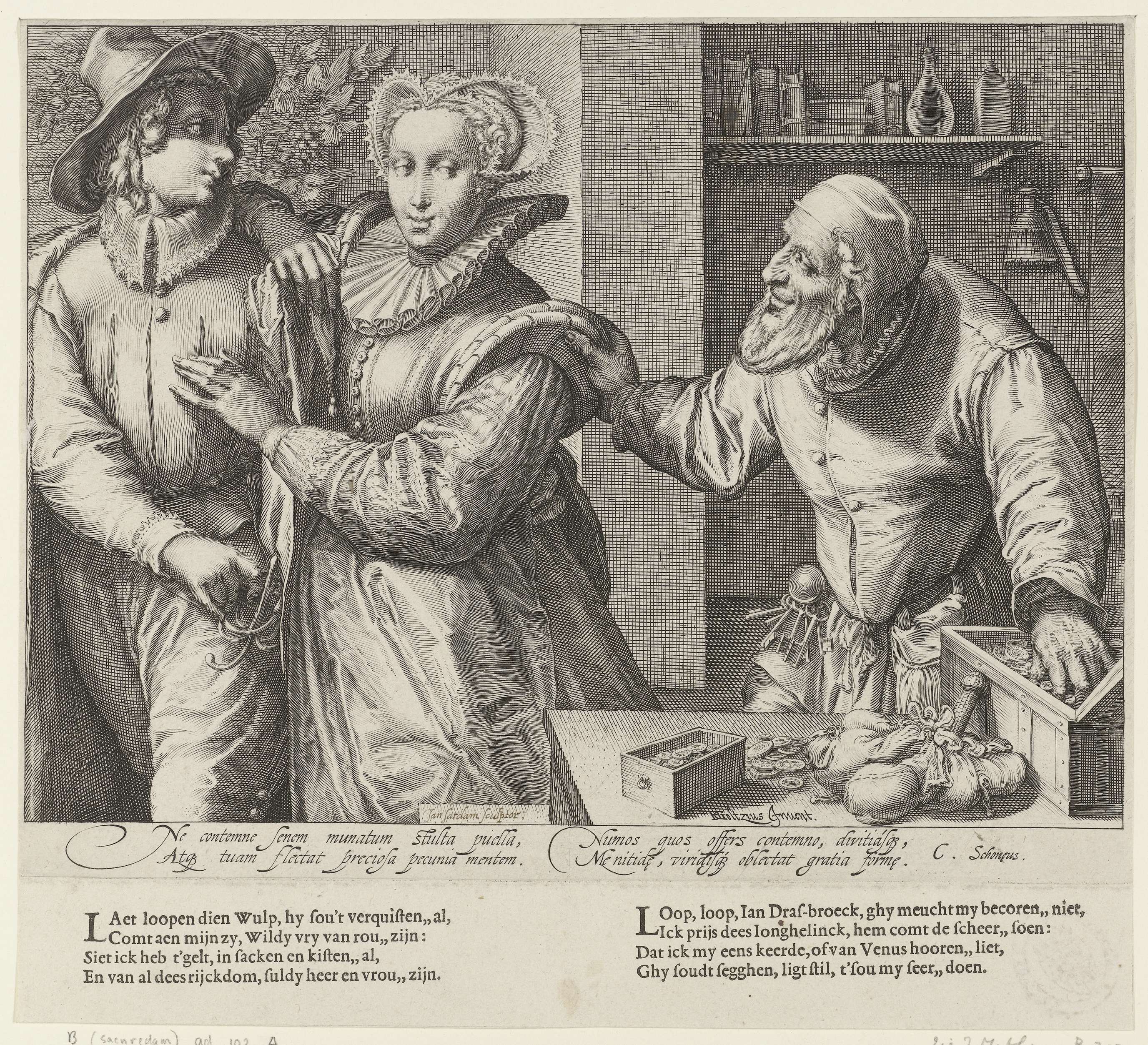 Een jonge vrouw staat tussen een oude man die haar geld aanbiedt en een jonge man op wie ze leunt. Ze draagt een boogmutsje op het hoofd, een brede geplooide kraag en een overkleed met schouderwielen. De oude man pakt haar vast en wijst haar op de gevulde geldkist op tafel en zijn stokkenbeurs. Hij ...