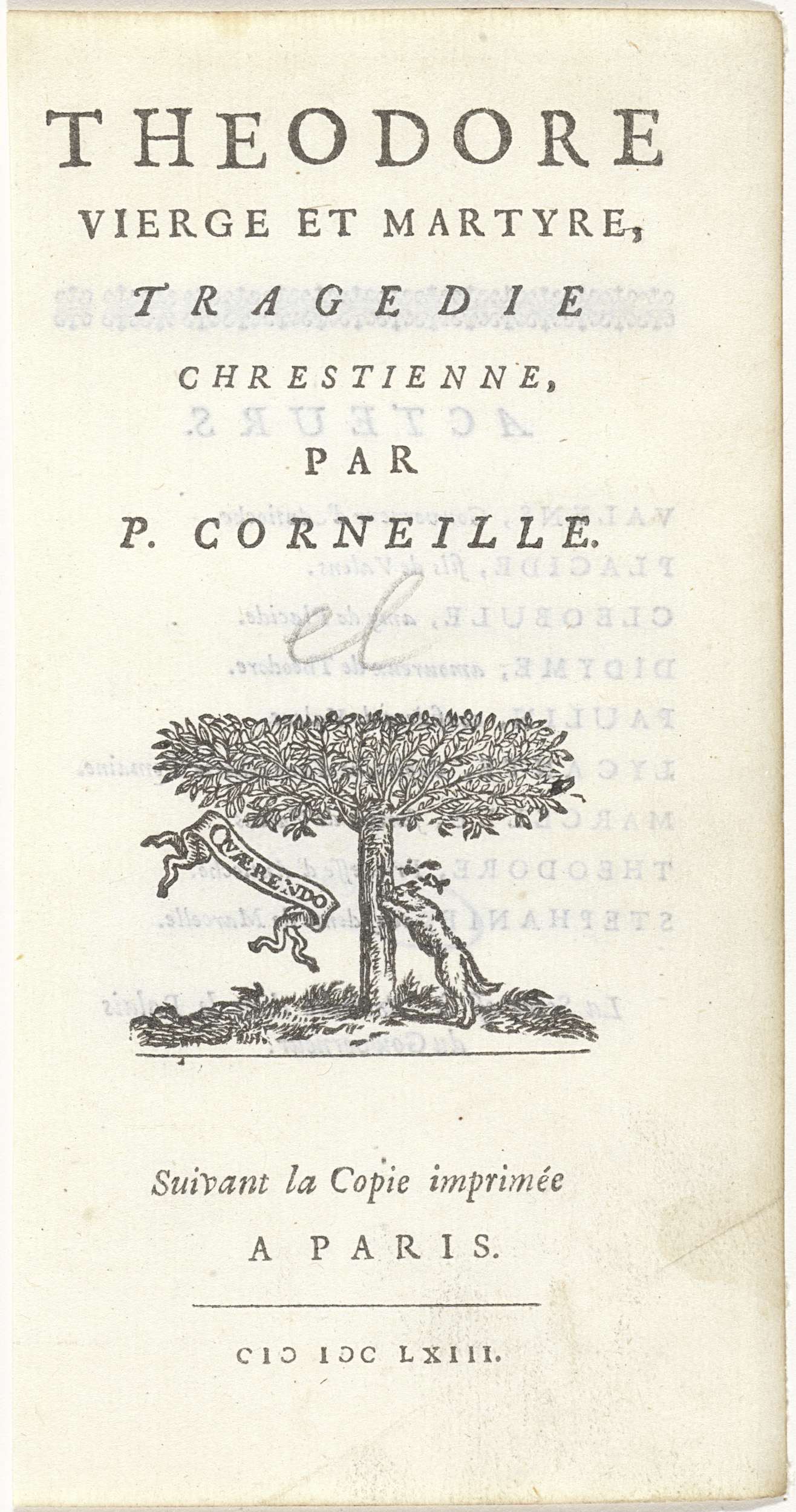 In het midden staat een hond rechtop tegen een boom. Hij zoekt iets in het gat van de boom. Links de Latijnse vertaling van 'al zoekend' op een spreukband. Verso een tekstblad met de rollen van het stuk.