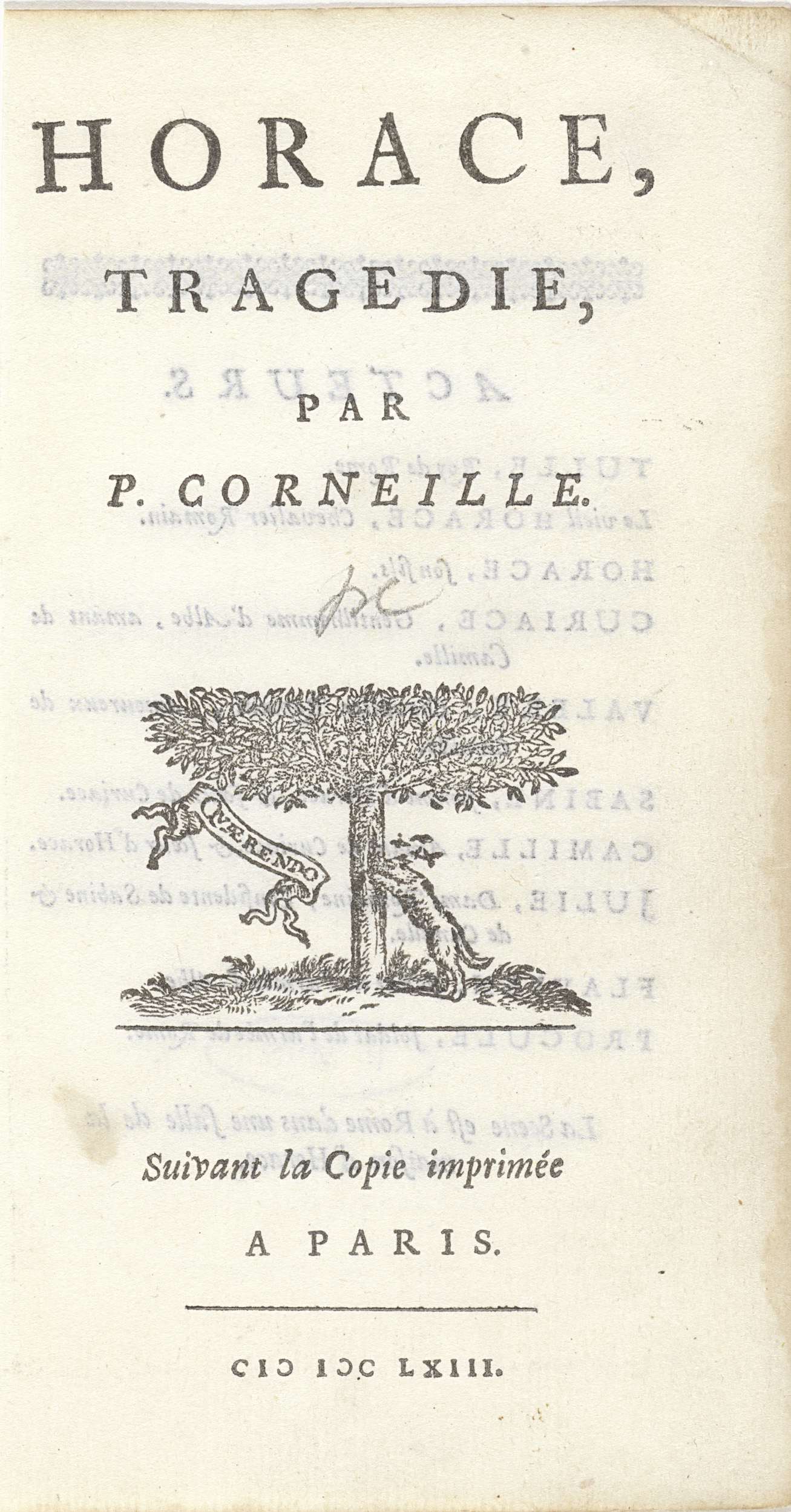 In het midden staat een hond rechtop tegen een boom. Hij zoekt iets in het gat van de boom. Links de Latijnse vertaling van 'al zoekend' op een spreukband. Verso een tekstblad met de rollen van de acteurs.