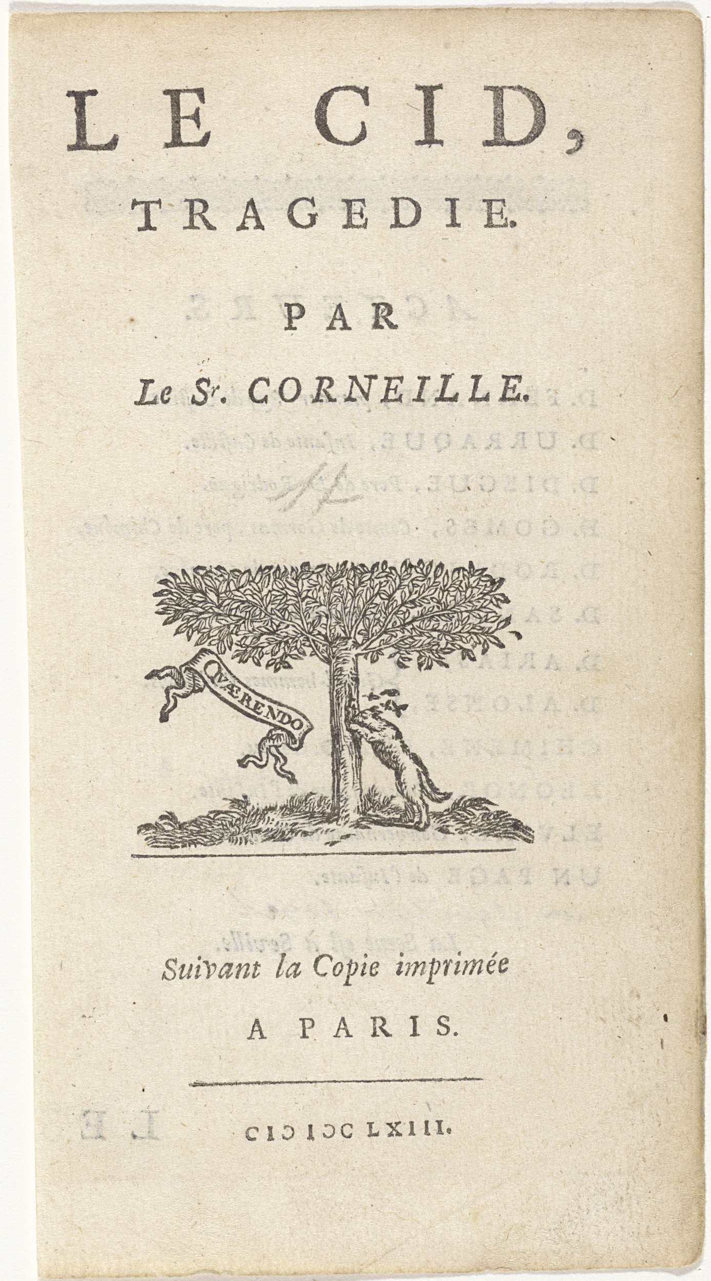 In het midden staat een hond rechtop tegen een boom. Hij zoekt iets in het gat van de boom. Links de Latijnse vertaling van 'al zoekend' op een spreukband. Verso een tekstblad met de rollen van de acteurs.