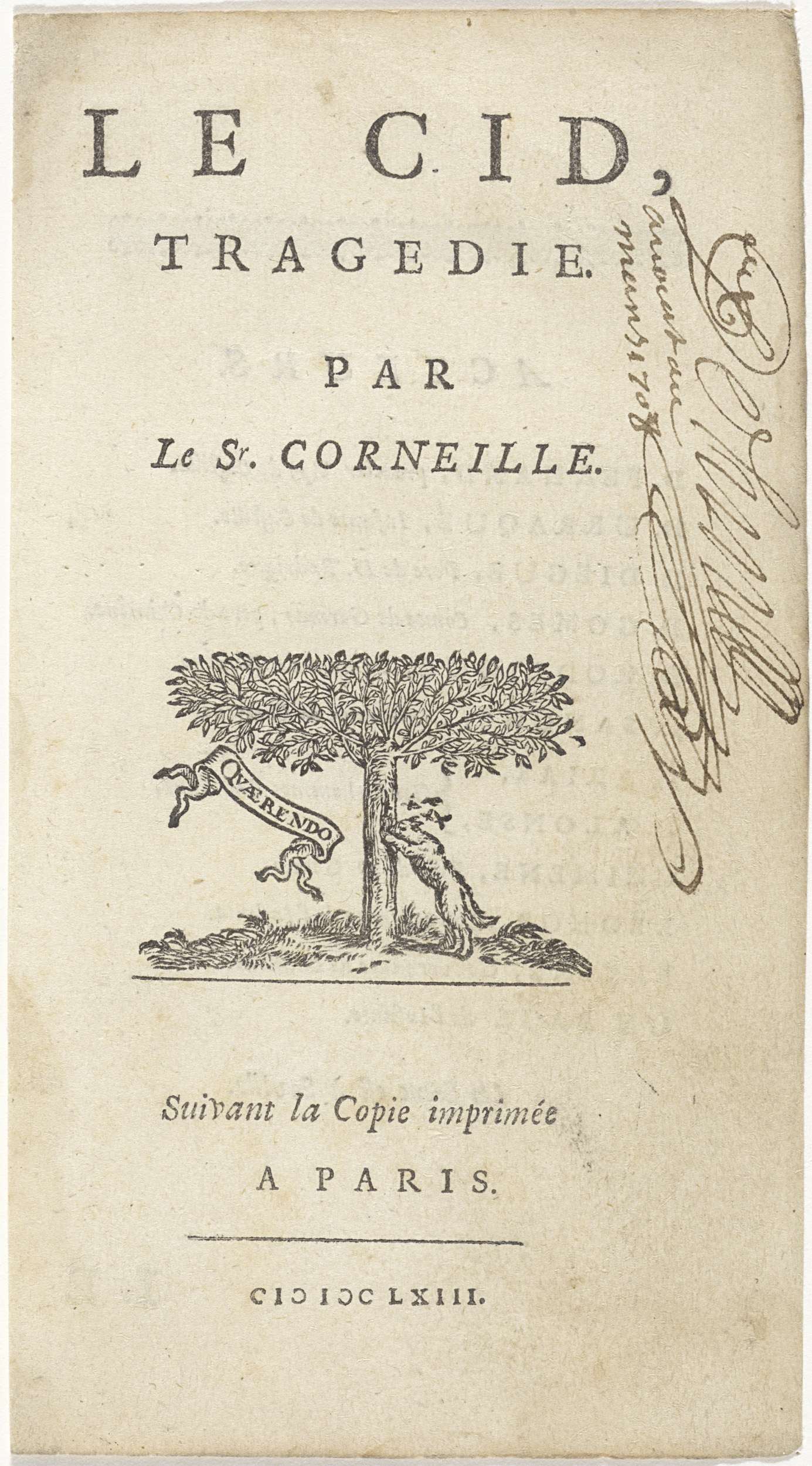 In het midden staat een hond rechtop tegen een boom. Hij zoekt iets in het gat van de boom. Links de Latijnse vertaling van 'al zoekend' op een spreukband. Verso een tekstblad met de rollen van de acteurs.