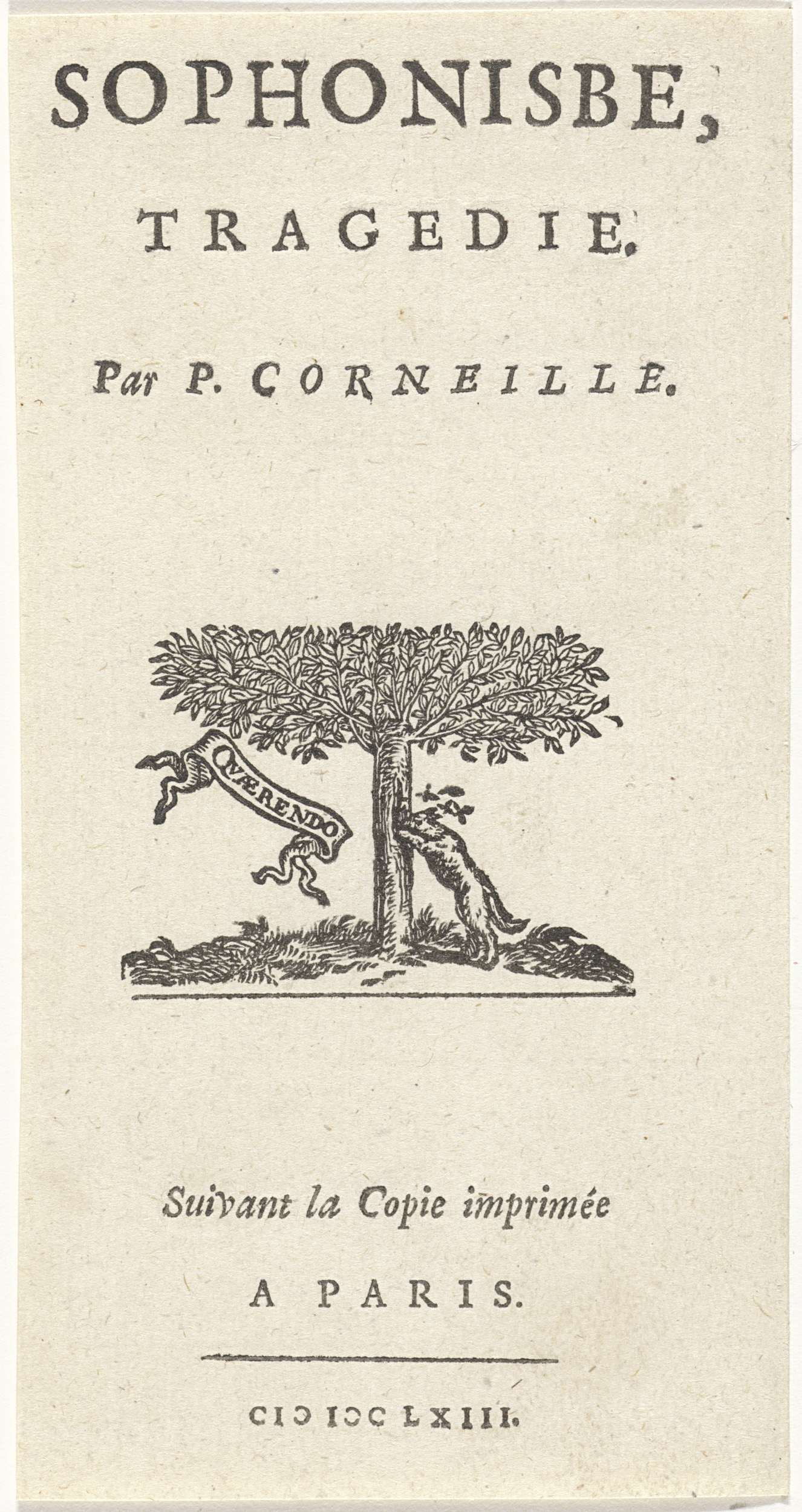 In het midden staat een hond rechtop tegen een boom. Hij zoekt iets in het gat van de boom. Links de Latijnse vertaling van 'al zoekend' op een spreukband.