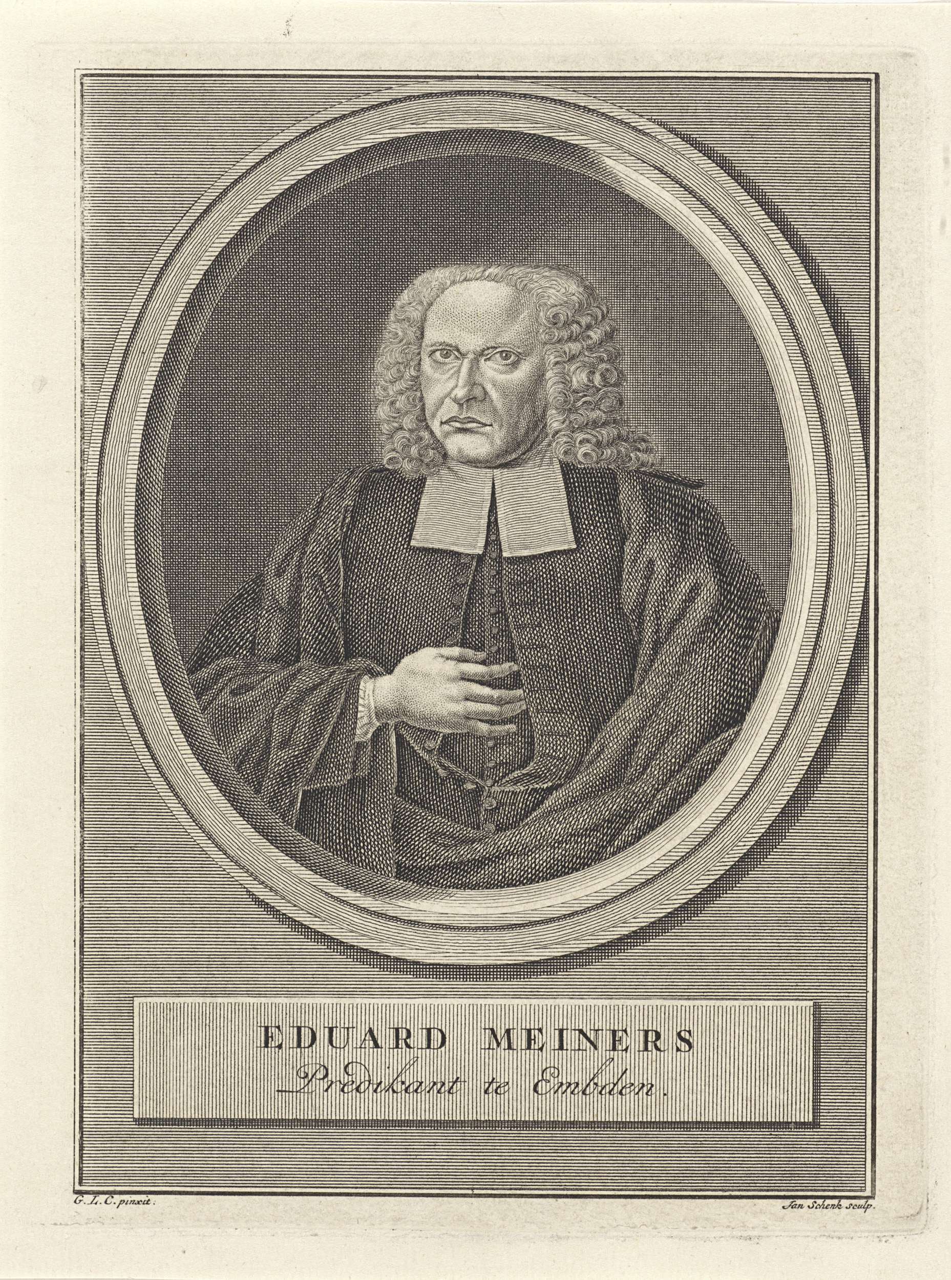 Portret naar links van de predikant Eduard Meiners met zijn rechterhand voor zijn borst. Daaronder zijn naam en functie. De voorstelling is in een omlijsting gevat.