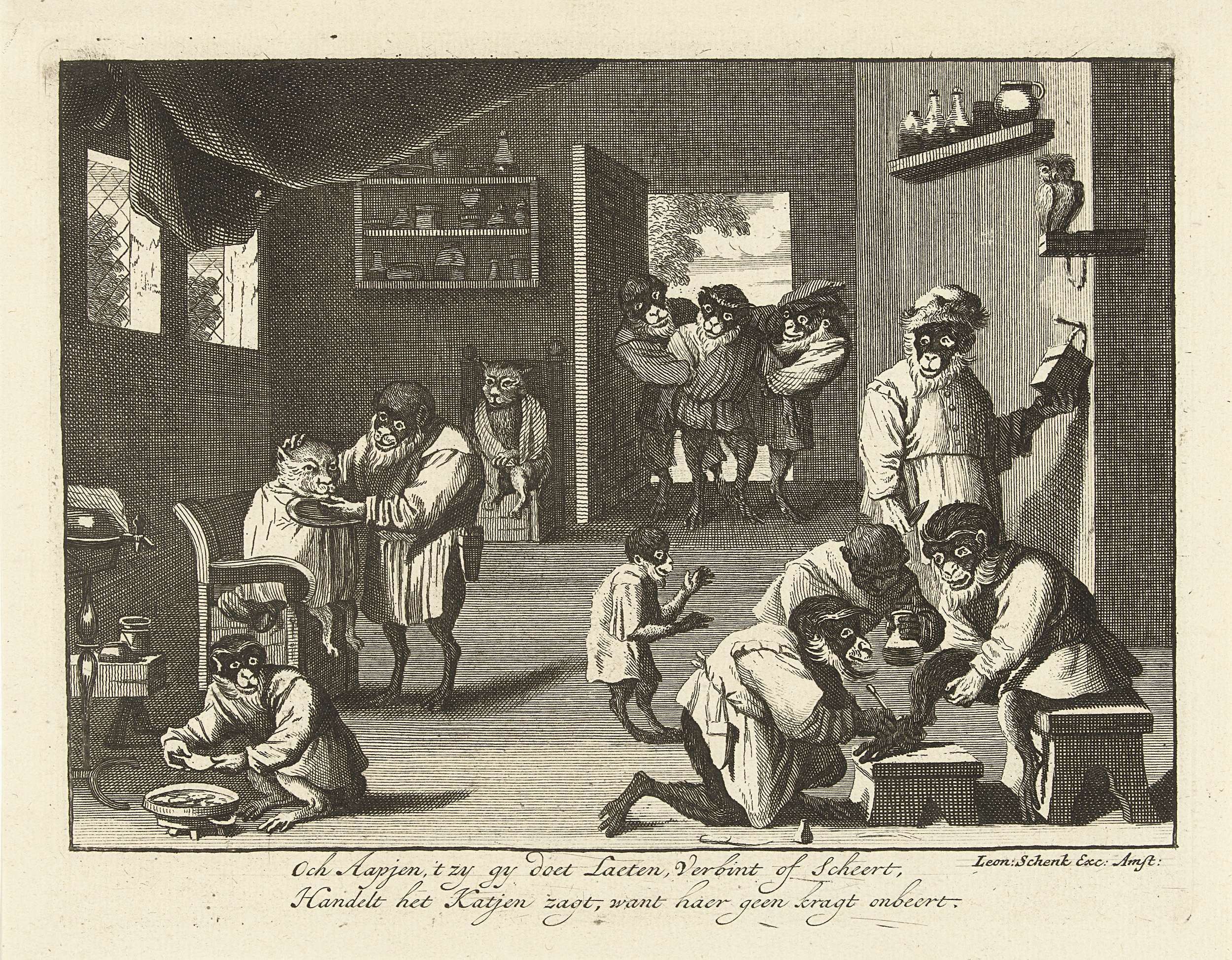 Apen en katten bij de barbier. Onderdeel van een serie bestaande uit een titelprent met 16 ongenummerde platen uit ca. 1720 waarin apen als mensen figureren in allerlei taferelen uit het dagelijks leven. Elke prent met een tweeregelig vers in het onderschrift.
