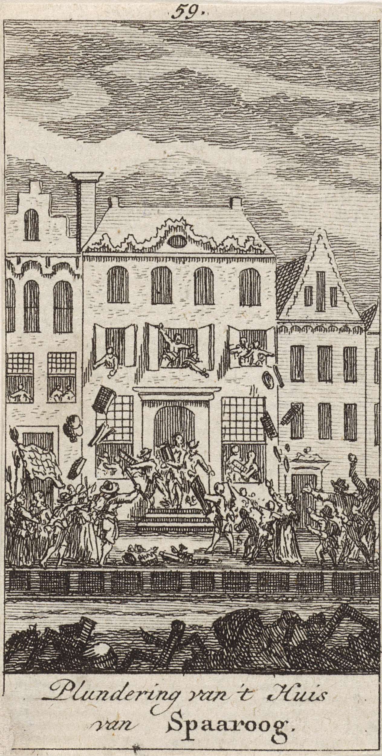 Plundering door een woedende menigte van het huis van kapitein Martinus Spaaroog aan de Reguliersgracht tijdens het Aansprekersoproer. Midden boven: 59.