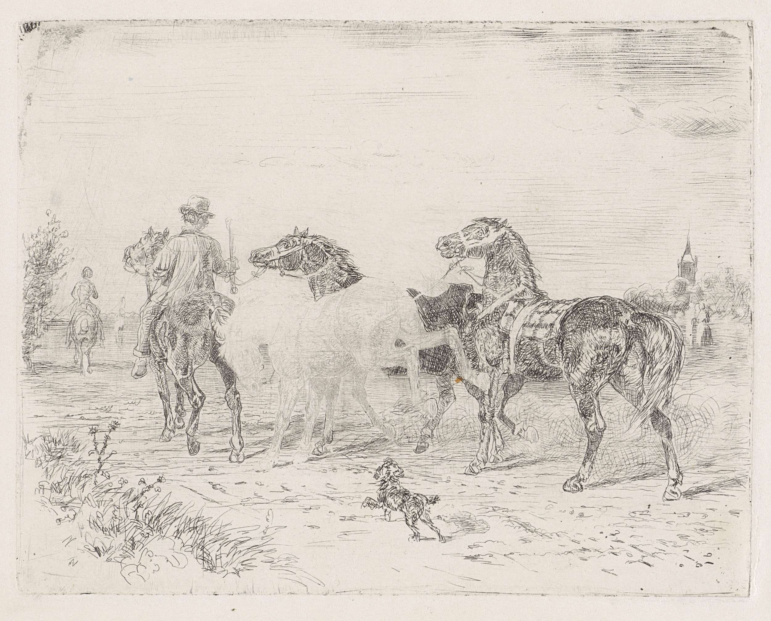 Ruiter die drie paarden, waaronder een schimmel, aan teugels meevoert. Voor hem rijdt een tweede ruiter. Vooraan springt een kleine hond. Rechts in de verte een kerktoren.