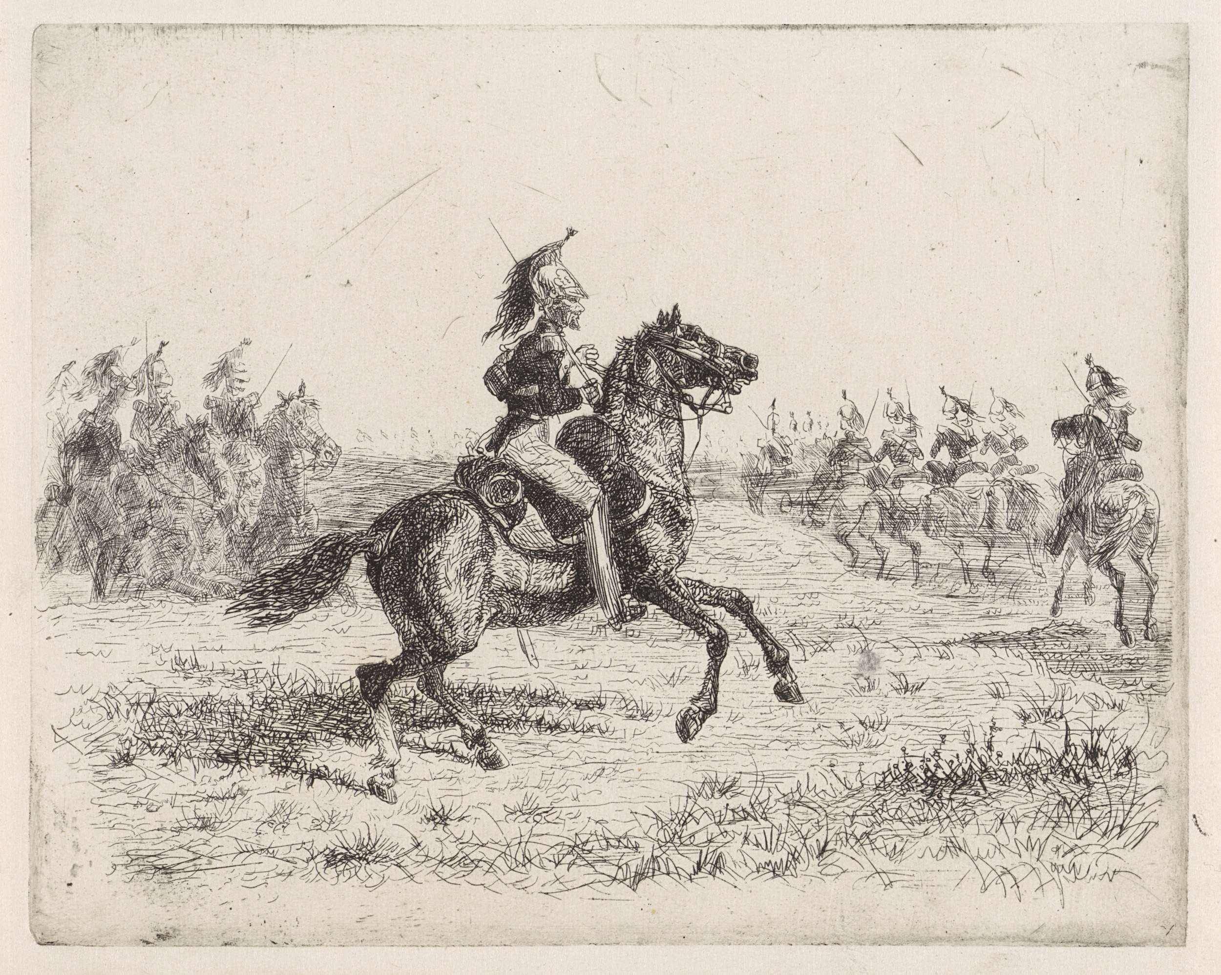 Vooraan een wachtmeester in wapenrusting op een paard in galop. Achter hem enkele cavaleristen, dragonders, op galopperende paarden.
