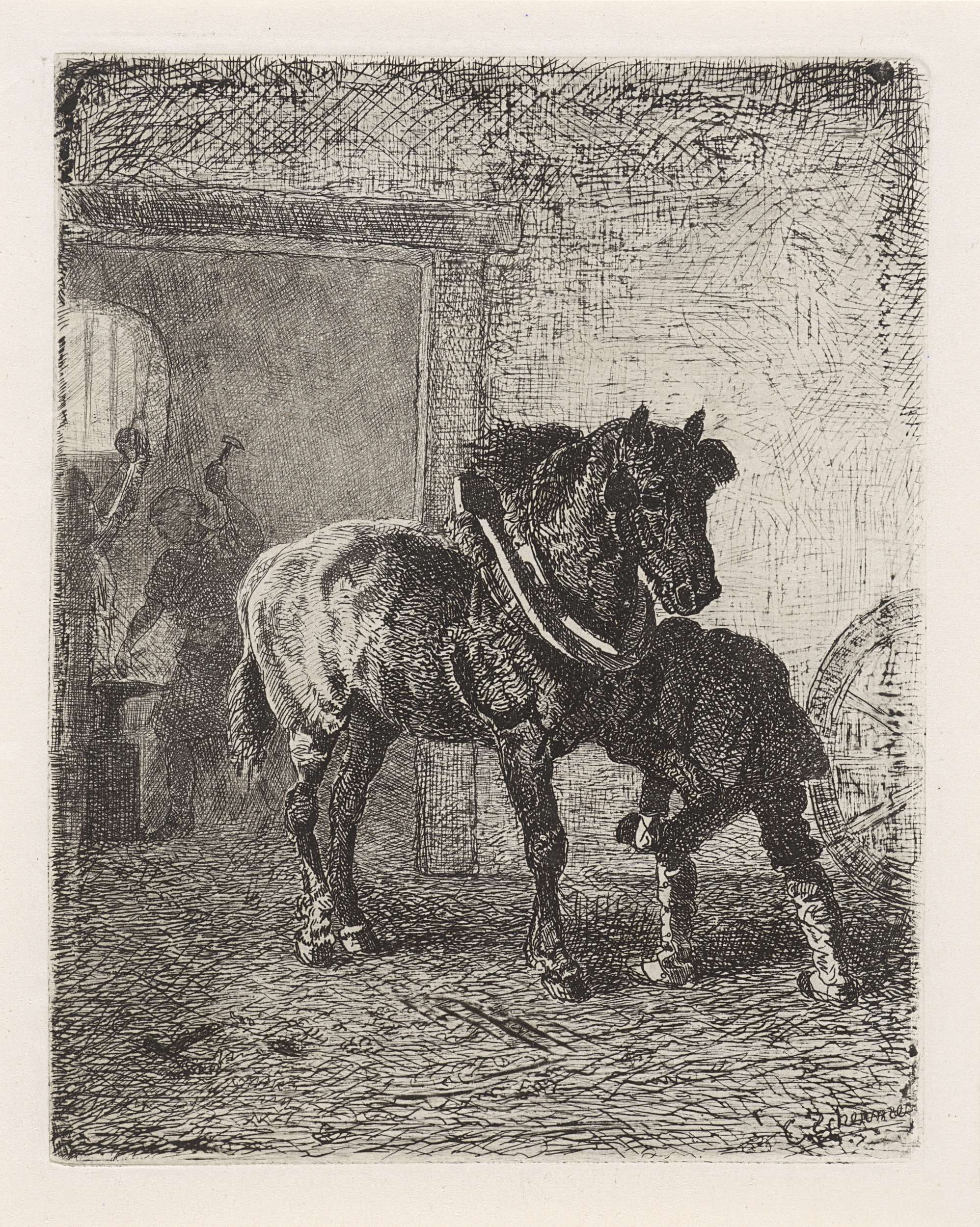 Vooraan beslaat een man de hoef van een paard. Achter hem is een smid in een smederij aan het werk bij een aambeeld.