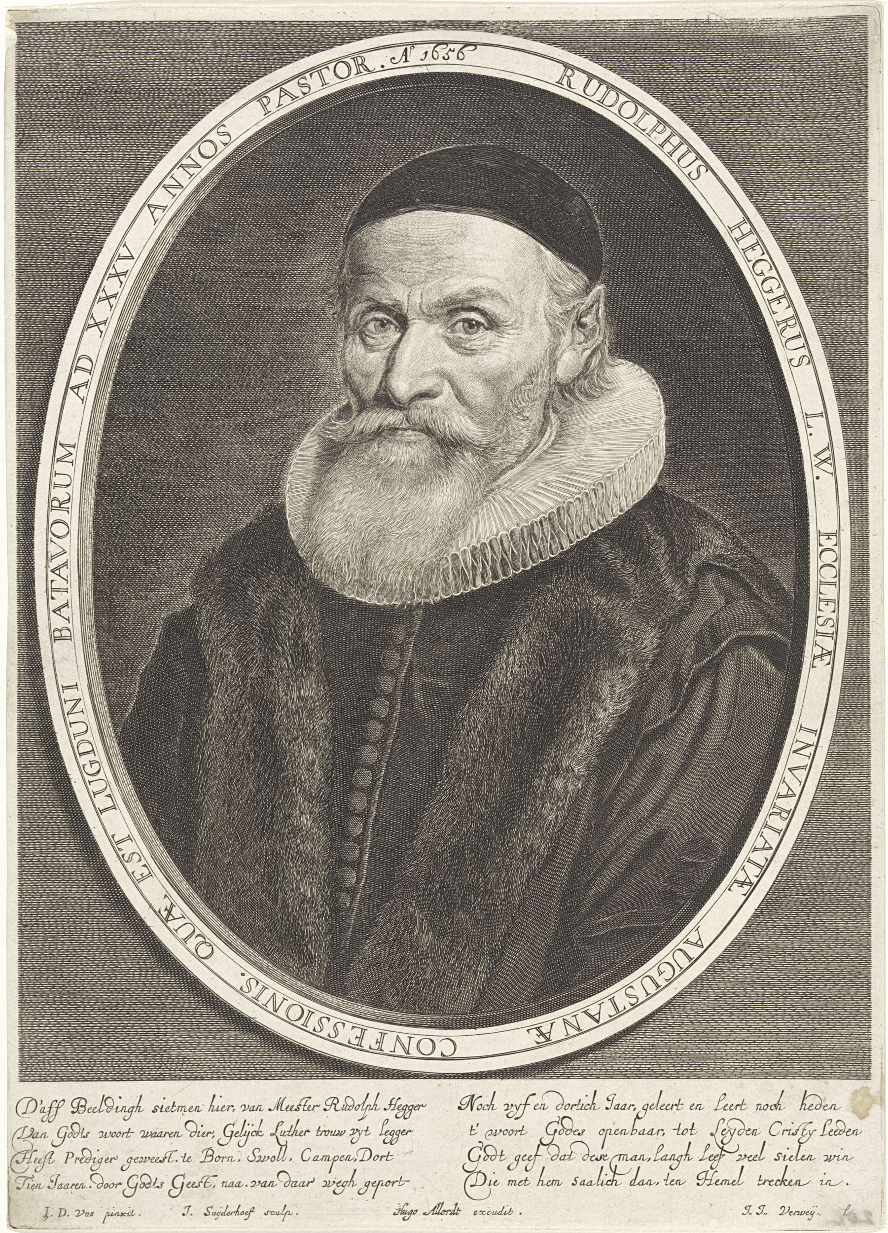 Portret van Rudolph Hegger, Luthers predikant te Leiden. Onderaan in de marge een twee vierregelige verzen in het Nederlands.