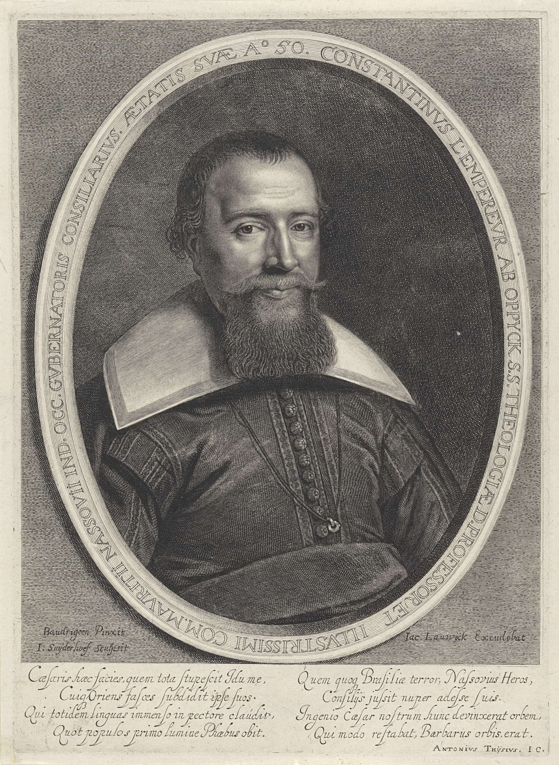 Portret van Constantijn van Oppyck l'Empereur, hoogleraar theologie aan de universiteit van Leiden en raadsheer van graaf Johan Maurits, op 50-jarige leeftijd. Onderaan in de marge twee vierregelige verzen in het Latijn.