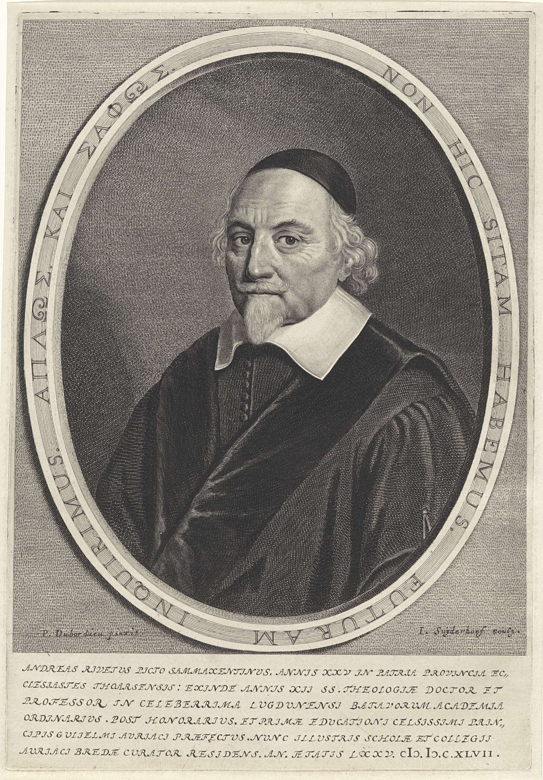 Portret van André Rivet, hoogleraar theologie aan de universiteit van Leiden en gouverneur van Prins Willem II, op 75-jarige leeftijd. Onderaan in de marge een zesregelige tekst in het Latijn.