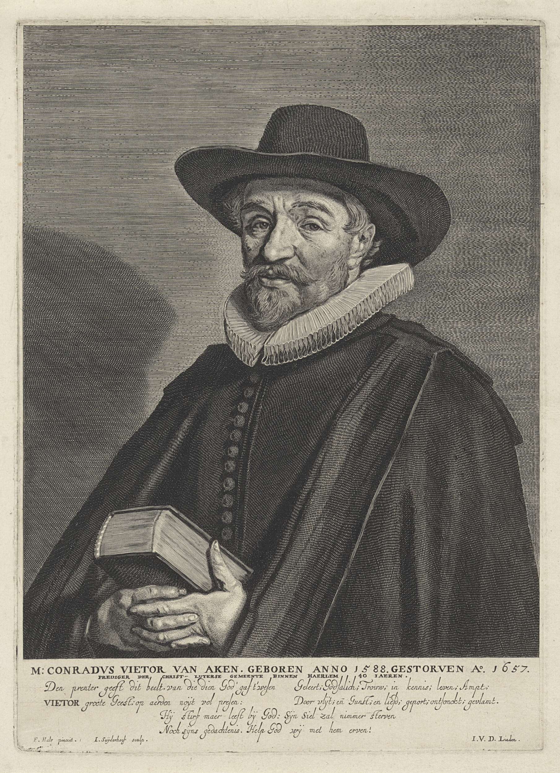 Portret van Conradus Viëtor, Luthers predikant in Haarlem, met een boek of bijbel in zijn handen. Onderaan in de marge een zesregelig vers in het Nederlands.