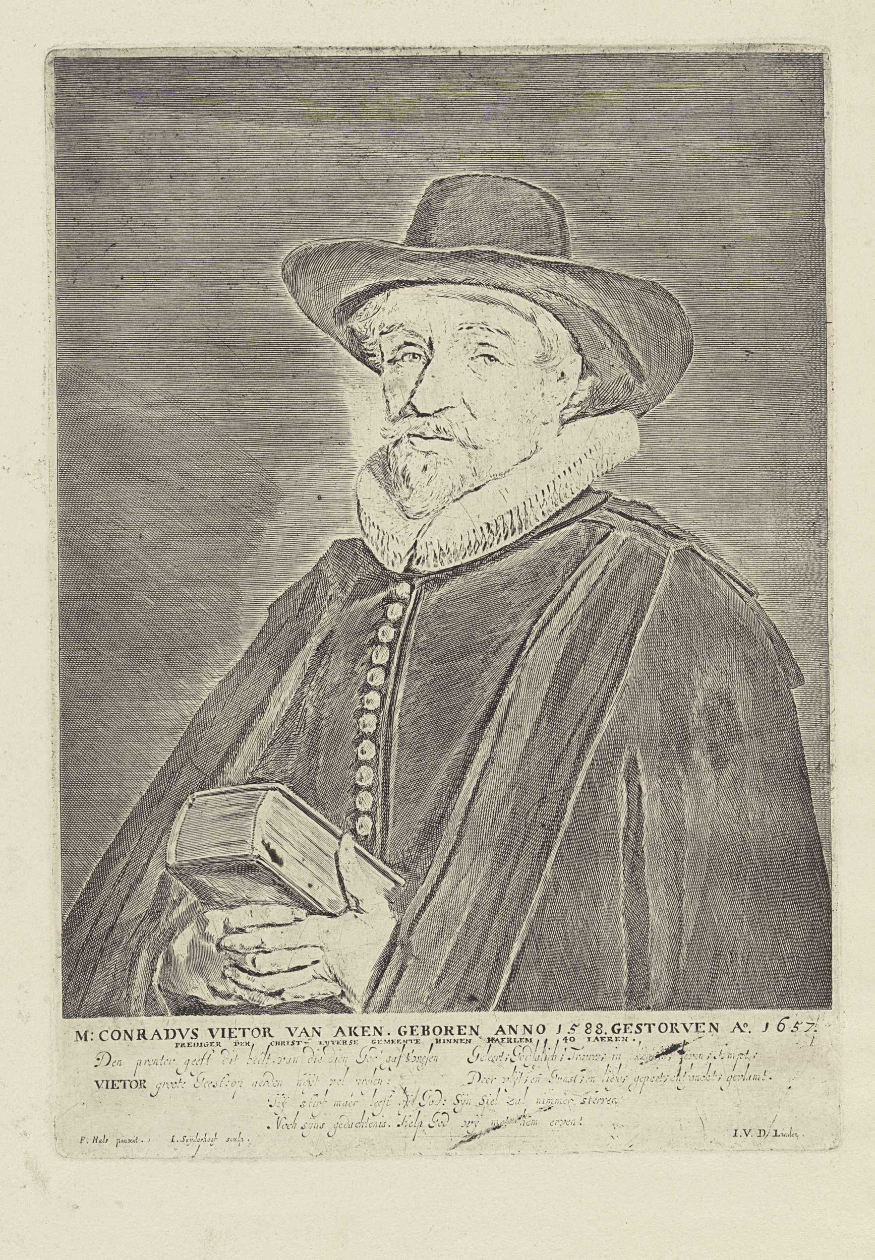 Portret van Conradus Viëtor, Luthers predikant in Haarlem, met een boek of bijbel in zijn handen. Onderaan in de marge een zesregelig vers in het Nederlands.