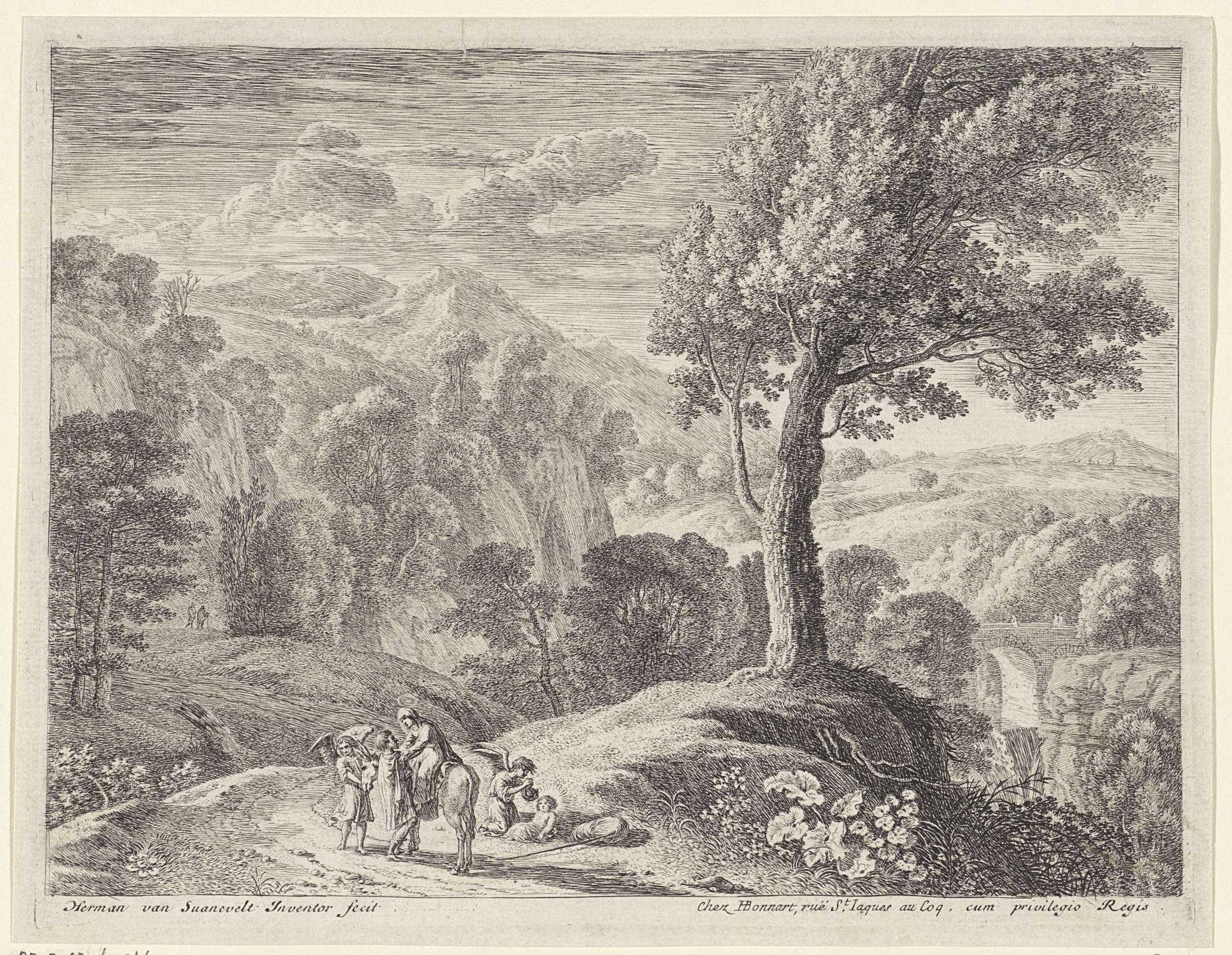 In een bergachtig landschap met boompartijen helpt Jozef Maria van de ezel, terwijl een engel de kop van de ezel vasthoudt. Achter de ezel ontfermt een tweede engel zich over Christus, die gewikkeld in een doek op de grond ligt.