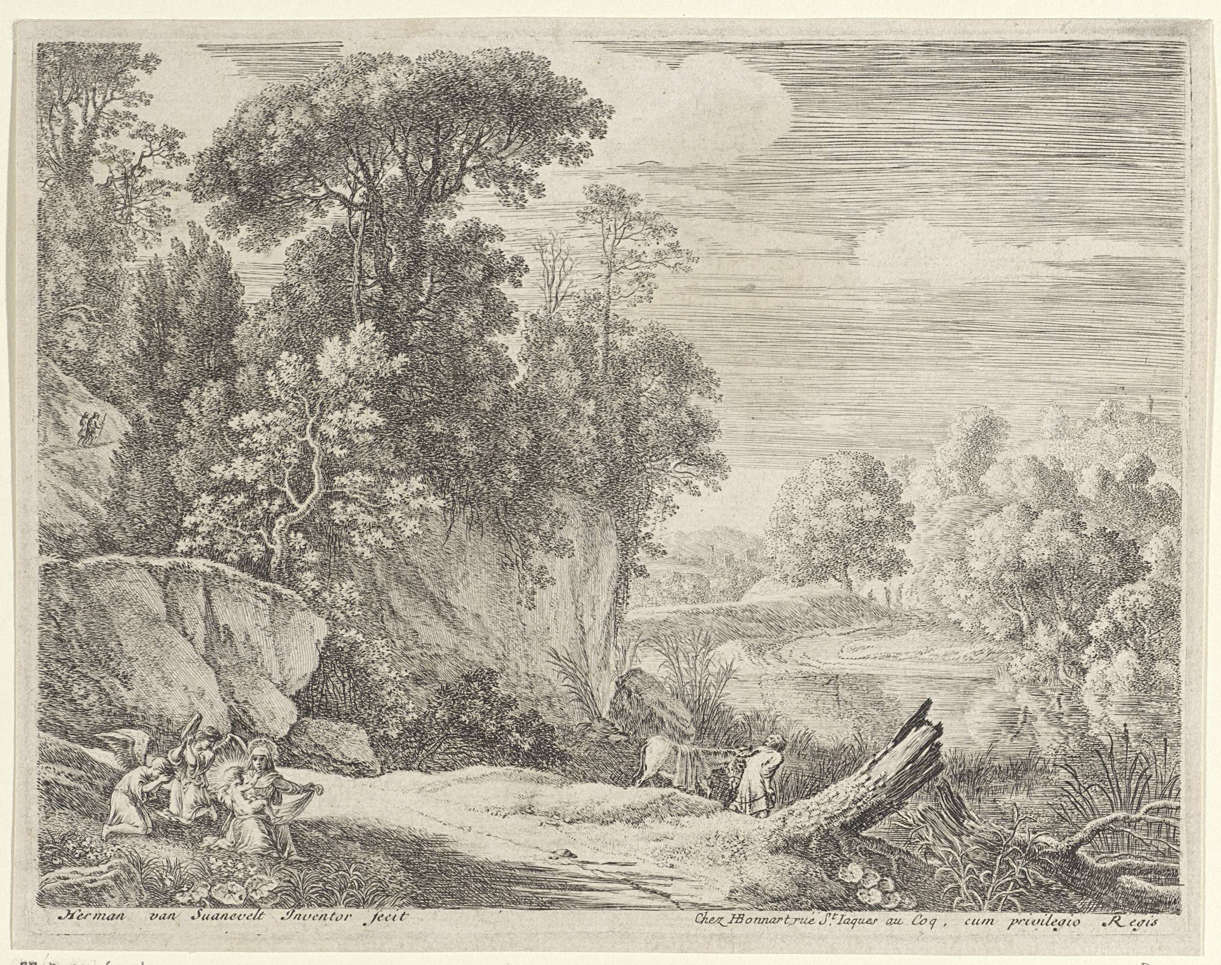 Er is een rotsachtig landschap met een rivier weergegeven. Links op de voorgrond knielt Maria met Christus op haar schoot. Naast haar knielen twee engelen, van wie de achterste een slaginstrument bespeelt. Achter hen leidt Jozef de ezel naar de rivier.