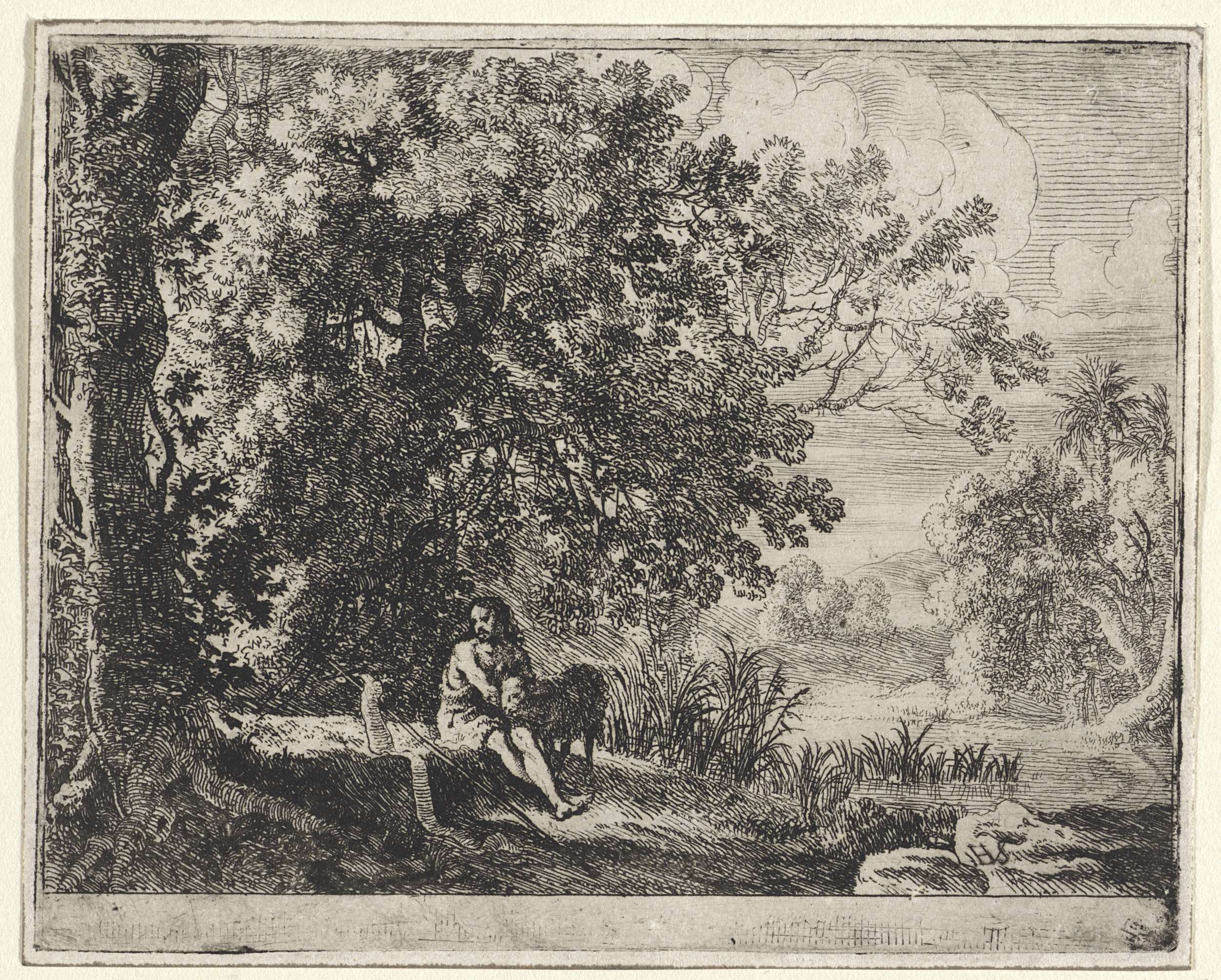Johannes de Doper zit aan de oever van een rivier. Hij wordt geflankeerd door zijn attributen, een houten kruis en een lam.