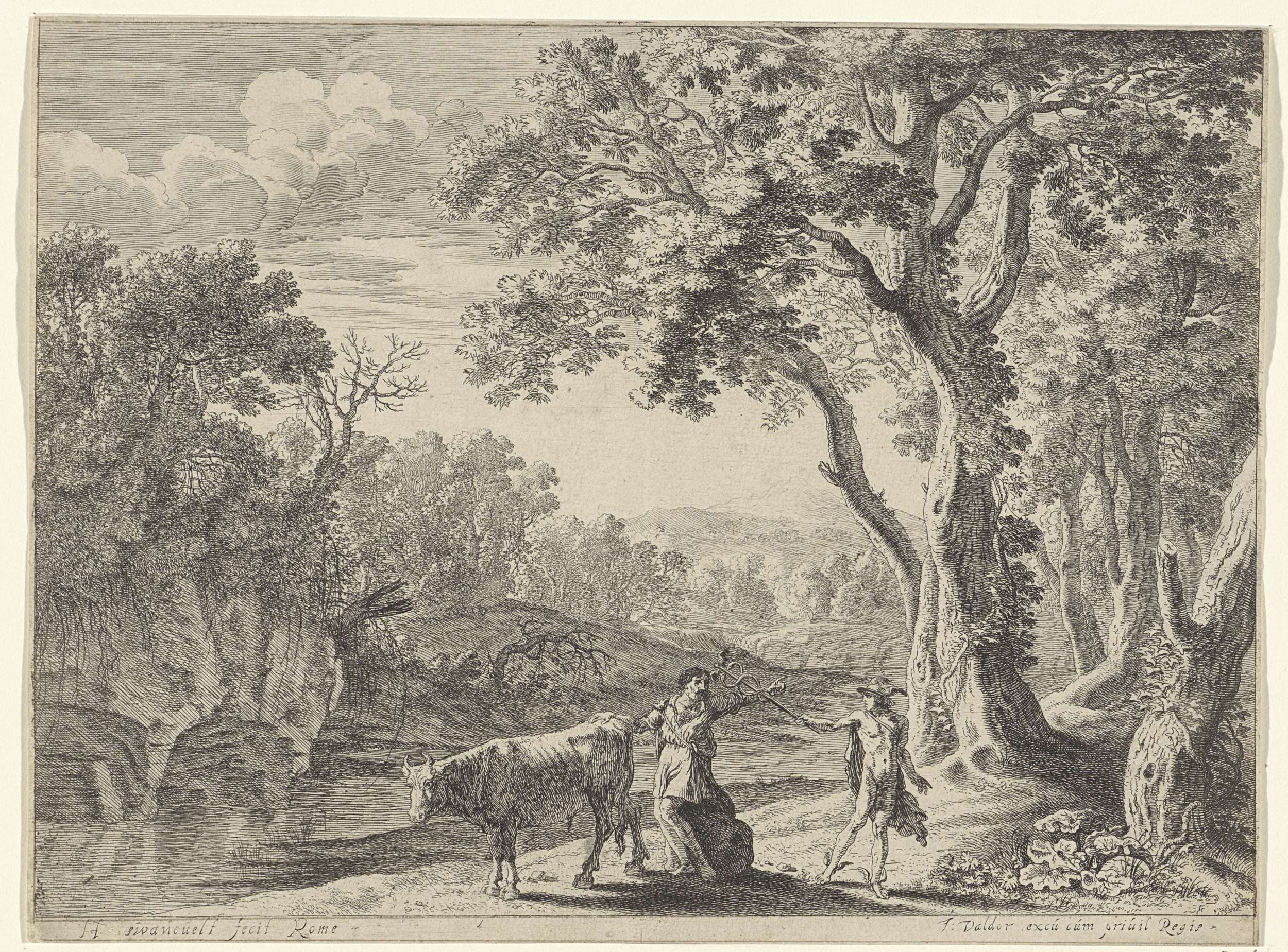 In een bosrijk landschap met een waterpartij staat boer Battus achter zijn koe op de voorgrond. Met zijn opgeheven linkerhand wijst hij in de richting van Mercurius die naast hem staat. Mercurius draagt gevleugelde schoenen, zijn gevleugelde helm en zijn caduceus, waarmee hij Battus aanraakt om hem in steen te veranderen.