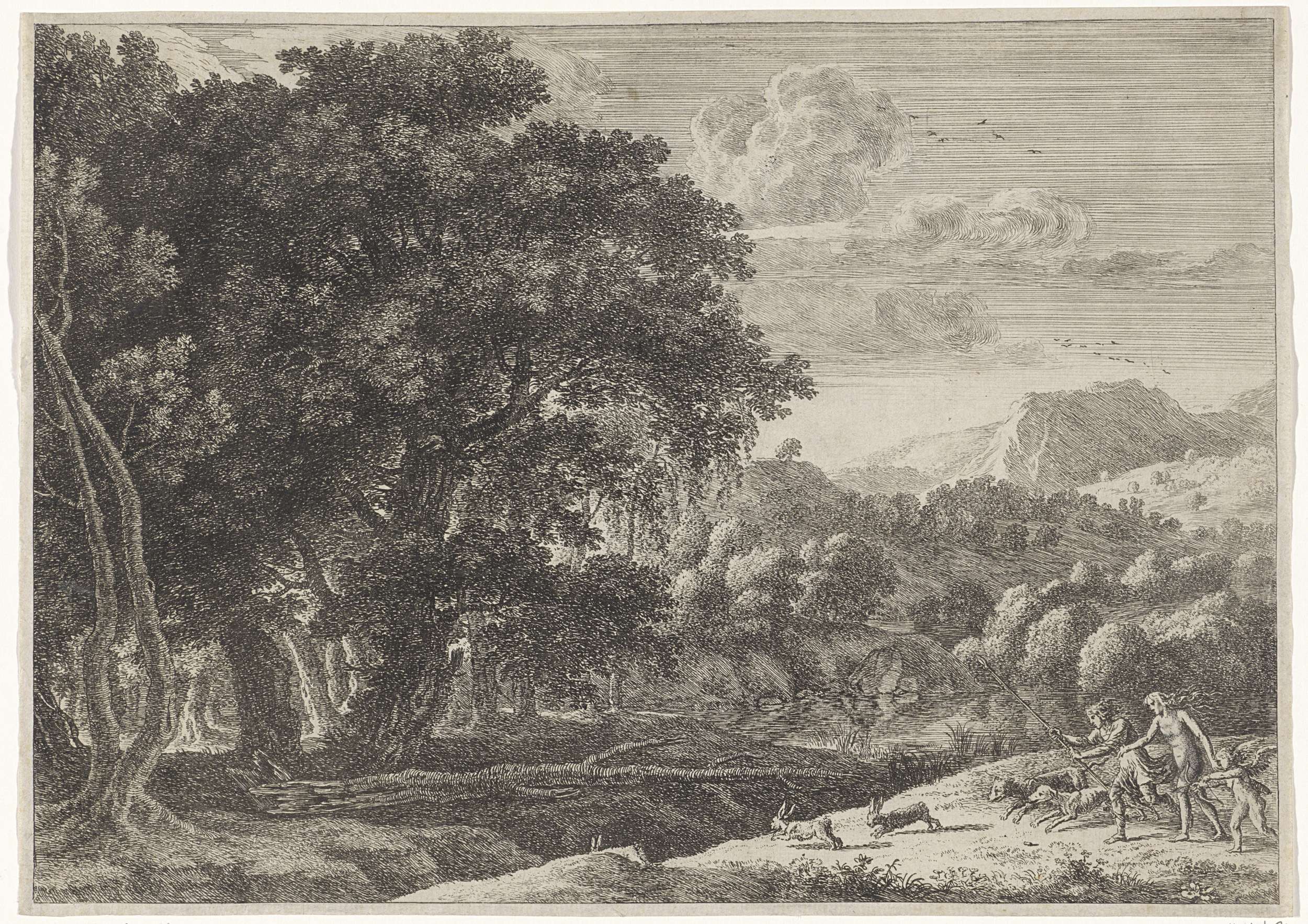 In een heuvelachtig, bosrijk landschap achtervolgen Venus, Adonis en Cupido drie hazen. Ze worden vergezeld door twee honden. Adonis draagt een speer en Cupido houdt een gespannen boog en pijl vast.