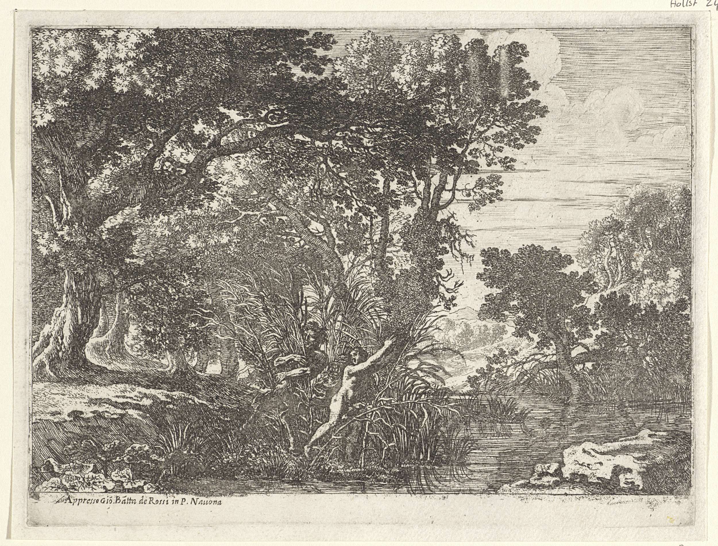 Pan omarmt een bos riethalmen, de nimf Syrinx, terwijl een nimf in het riet voor hem wegvlucht in de richting van de rivier.