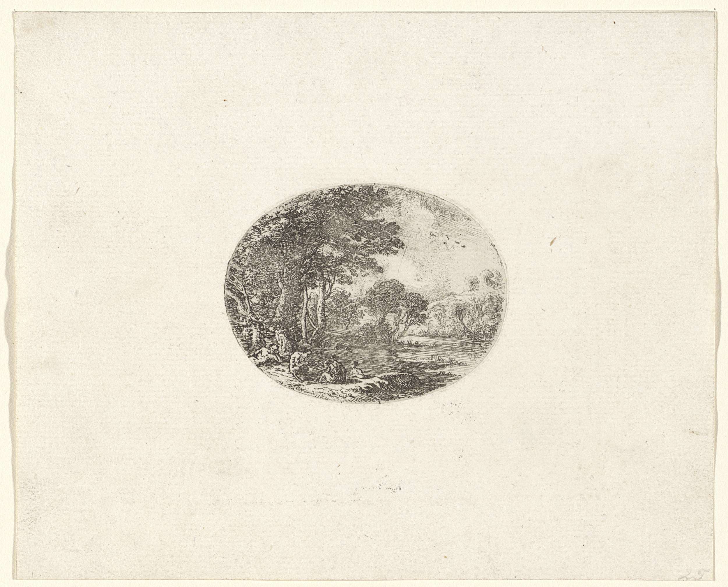 Een sater bespeelt een panfluit te midden van een andere sater, twee nimfen en een jong kind of sater.